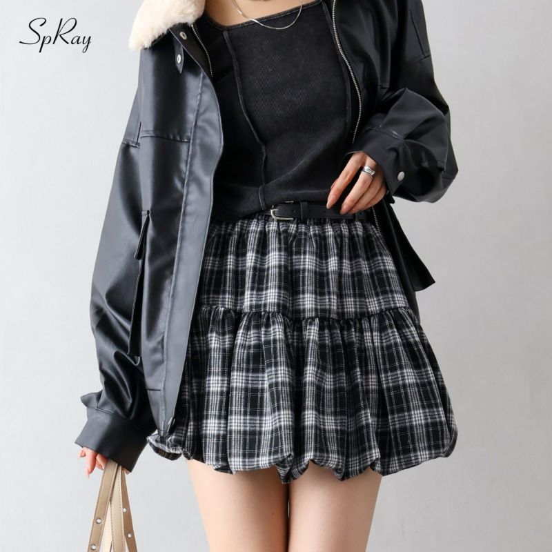 【SpRay ベルト付きチェックバルーンミニスカート】