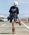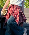 アシンメトリーな裾のラインが動きを生み出す、デザイン性の高いミニスカートです。ウエスト部分にボリュームのあるリボン風のディテールを施すことで、腰回りにアクセントを加えつつ、スタイルアップ効果も期待できるシルエットに仕上げました。不規則なカッティングが歩くたびに表情を変え、チェック柄のトラッドな雰囲気をプラスした、コーディネートの主役になる一着です。