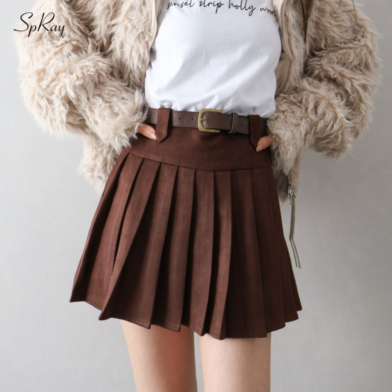 【SpRay ベルト付フェイクスウェードプリーツミニスカート】