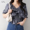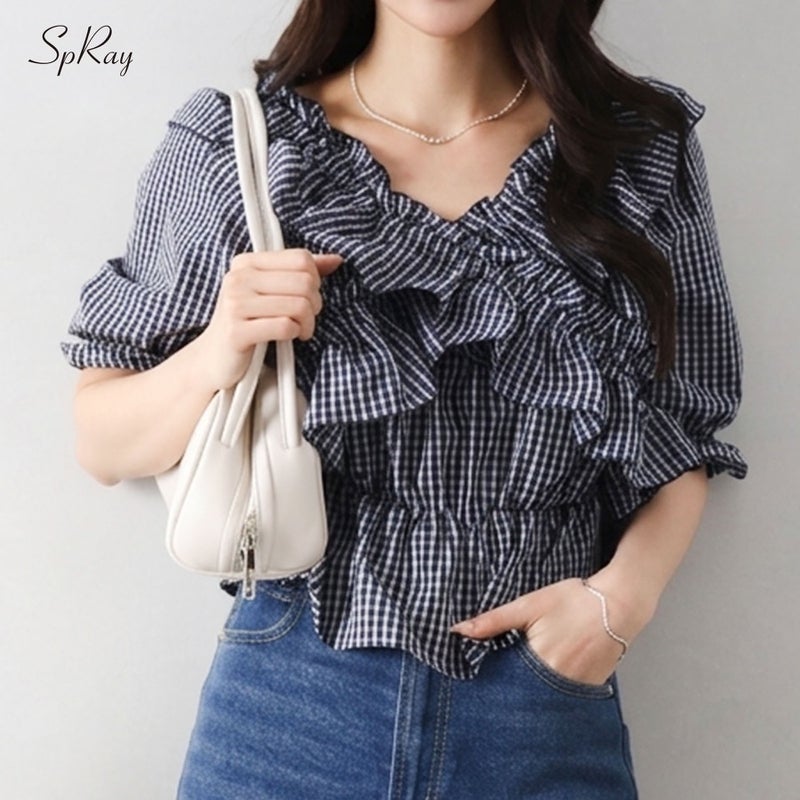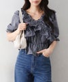 【SpRay チェッククロスフリル5分袖ブラウス】