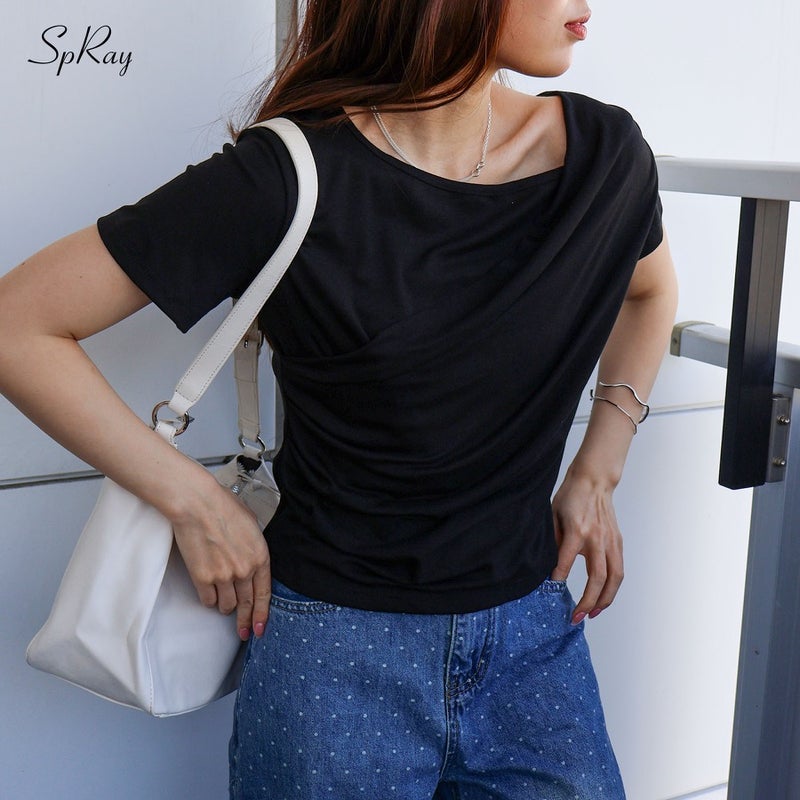 フロントの流れるようなドレープとサイドのシャーリングが、女性らしい立体的なシルエットを演出します。広めのネックラインはデコルテを美しく見せ、オフショルダーとしても着用可能。ストレッチ素材で、デイリーから華やかなシーンまで着心地よく彩る一着です。