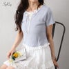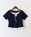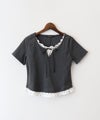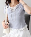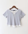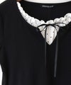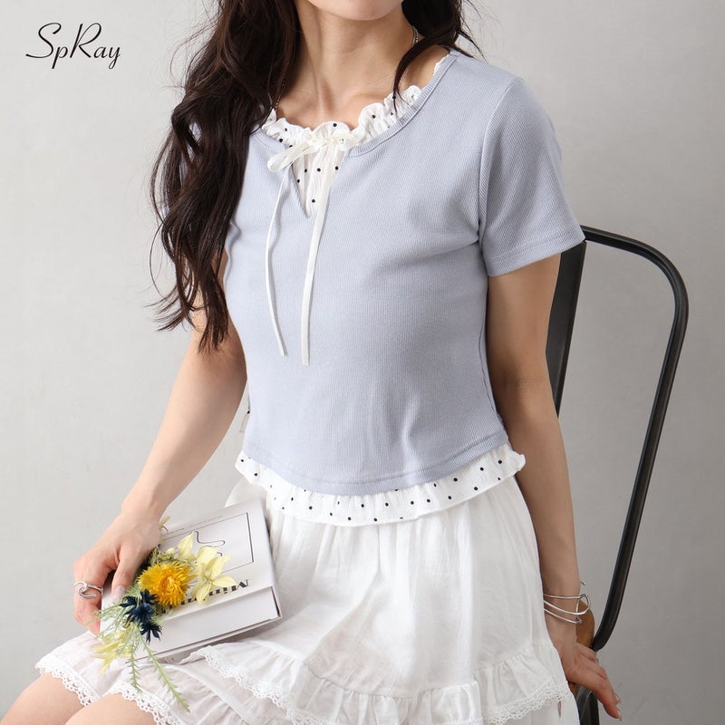 デコルテを綺麗に見せるスクープネックの胸元や裾から、繊細なドット柄のフリルを覗かせたレイヤード風デザインが特徴です。フロントの華奢なリボンが程よい甘さをプラスし、1枚でトレンドのバレエコアやガーリーなスタイルが完成します。身体に優しくフィットするコンパクトなシルエットで、ハイウエストのボトムスとも相性抜群な1着です。