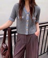 フロントに並んだゴールドの飾りボタンが、ヴィンテージライクで高級感のある雰囲気を演出。程よく体にフィットするリブ素材とスッキリとしたVネックが、女性らしいシルエットを引き立てます。ボタンを閉じてトップスとして着用するのはもちろん、羽織りとしてもサマになる、こなれ感たっぷりの一着です。