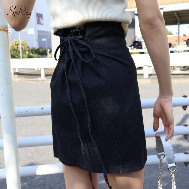【SpRay ハイウエストレースアップデニムミニスカート】