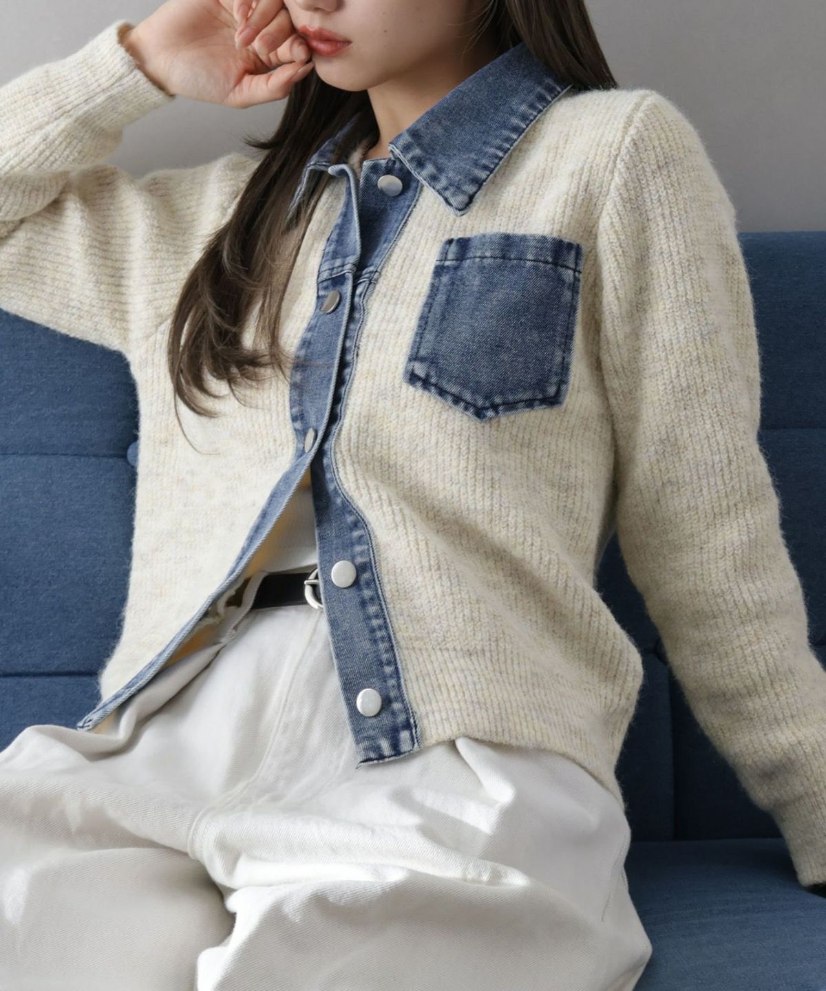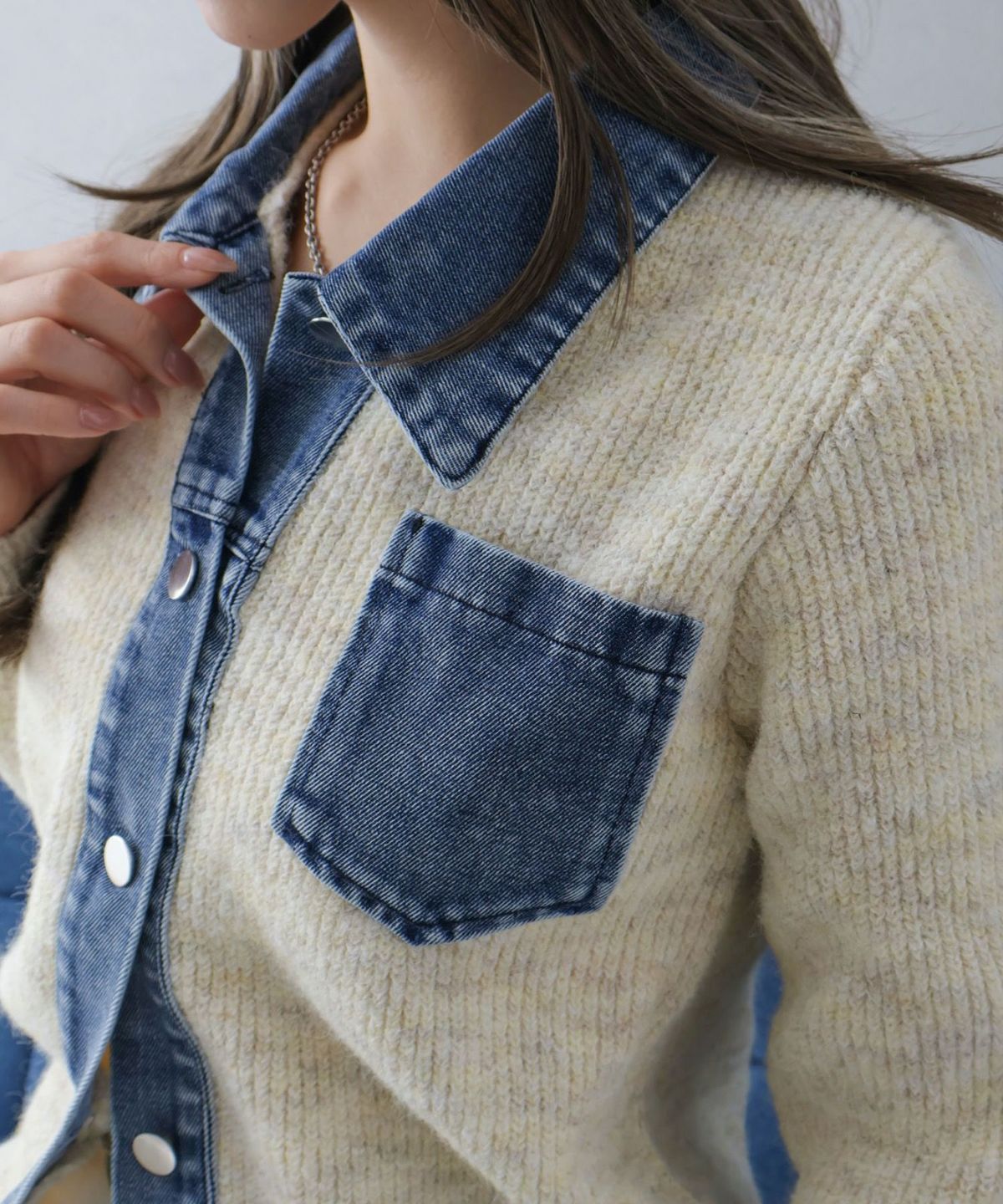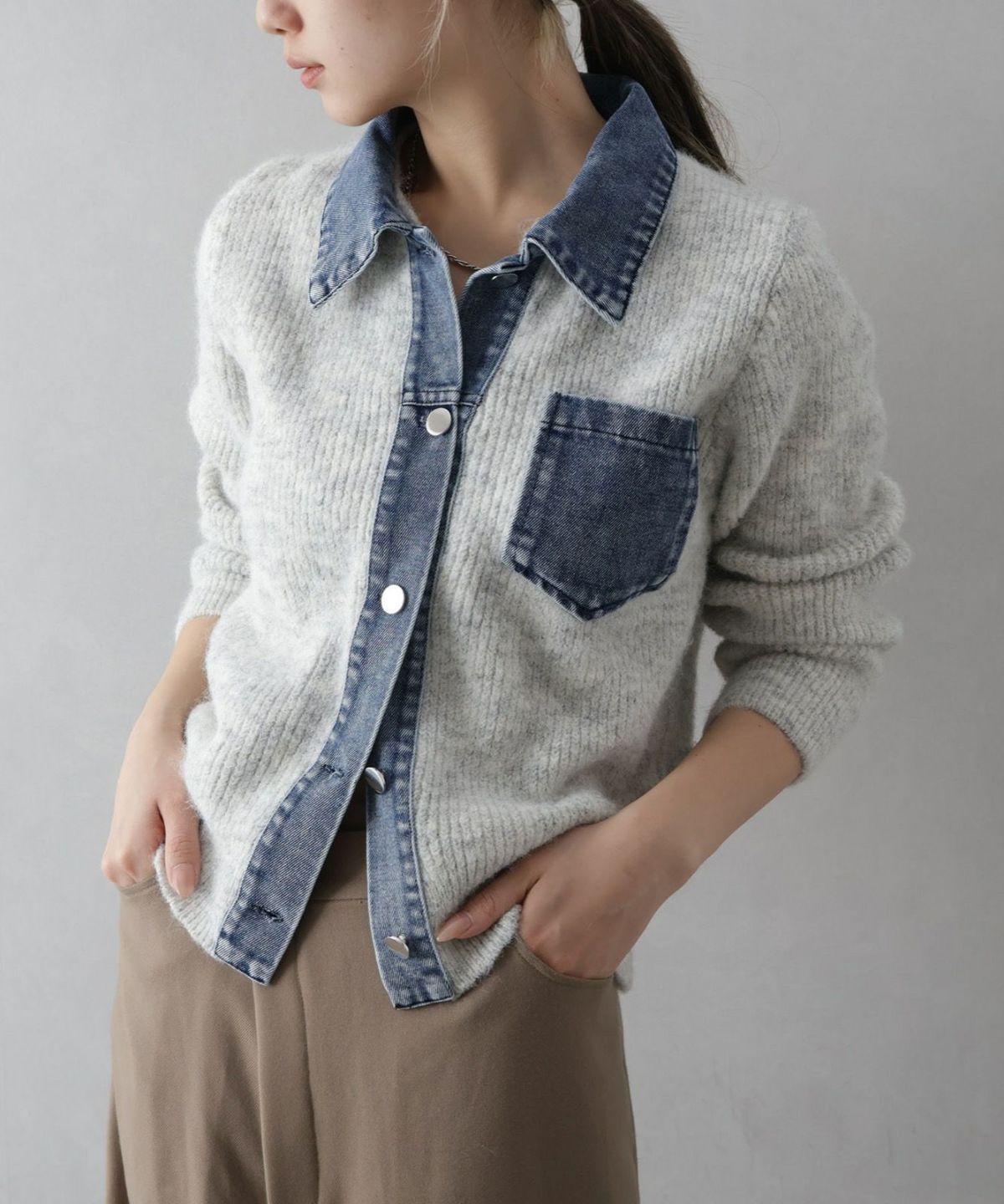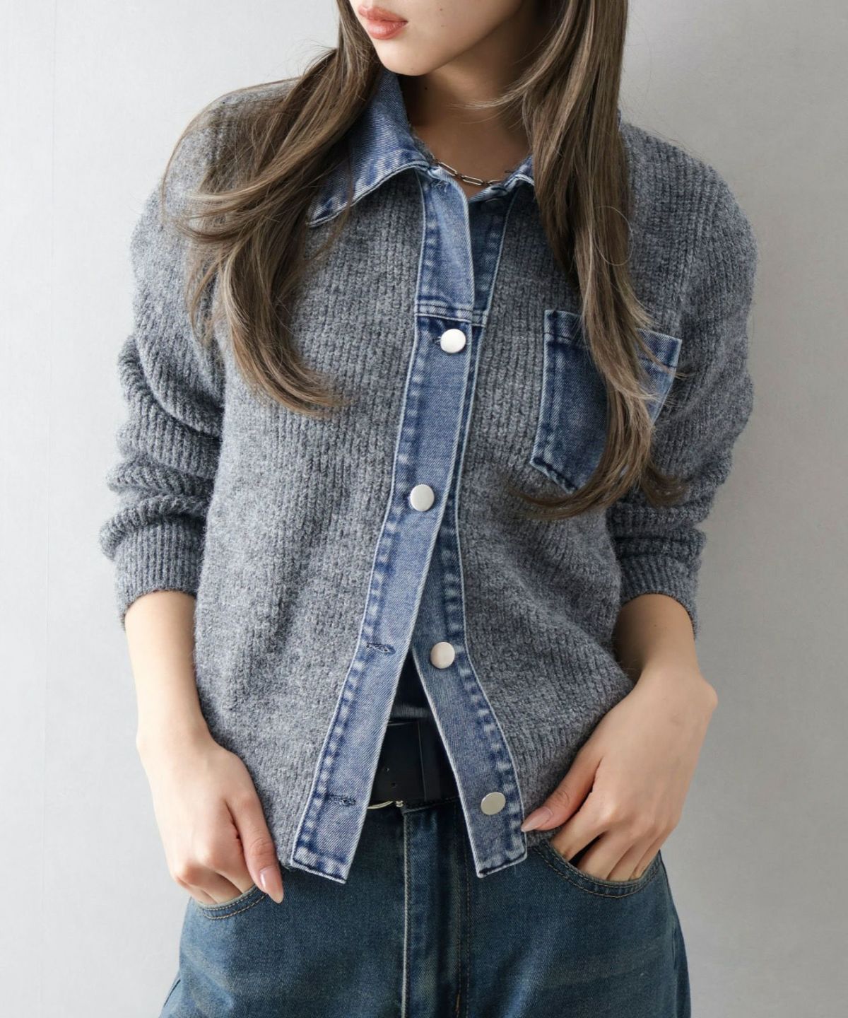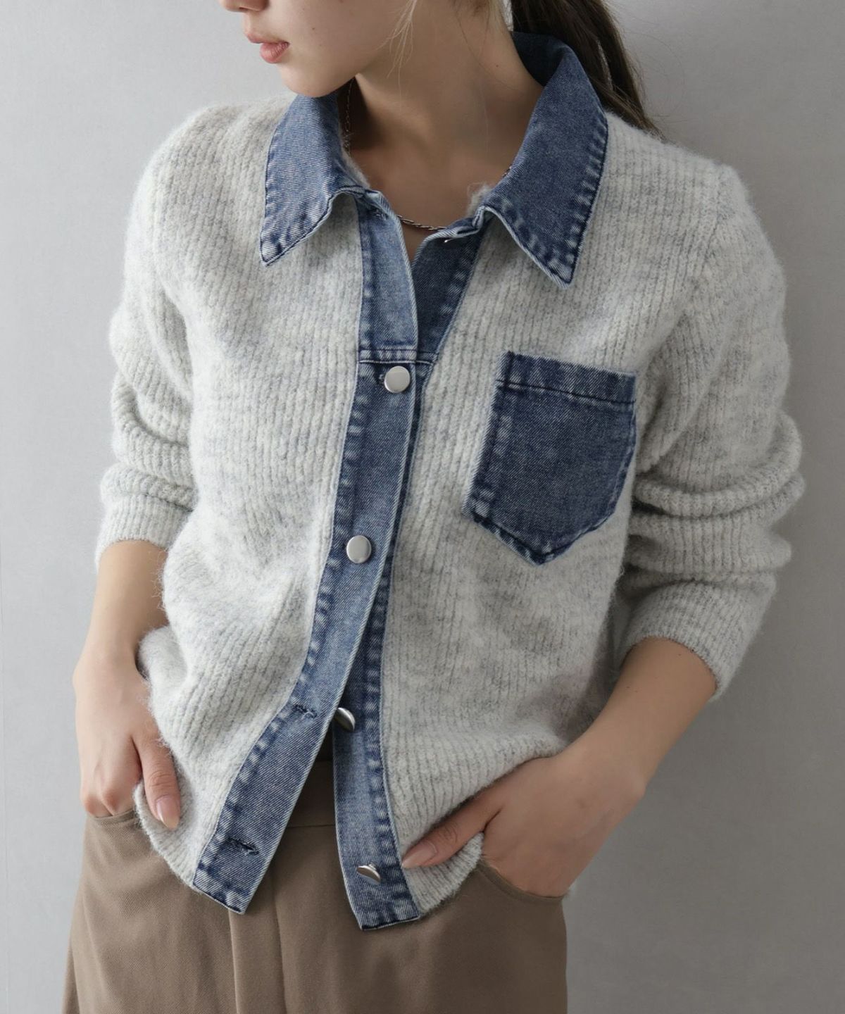 デニムポケット付き切替フェイクレイヤードカーディガン