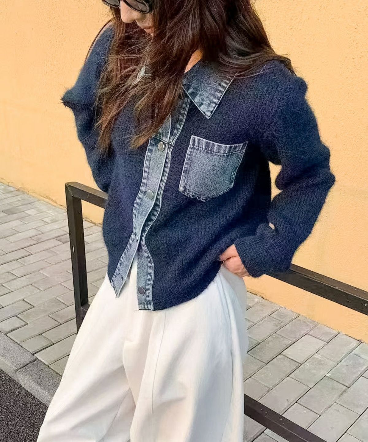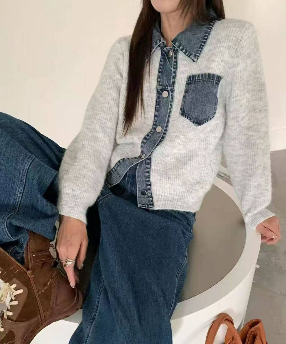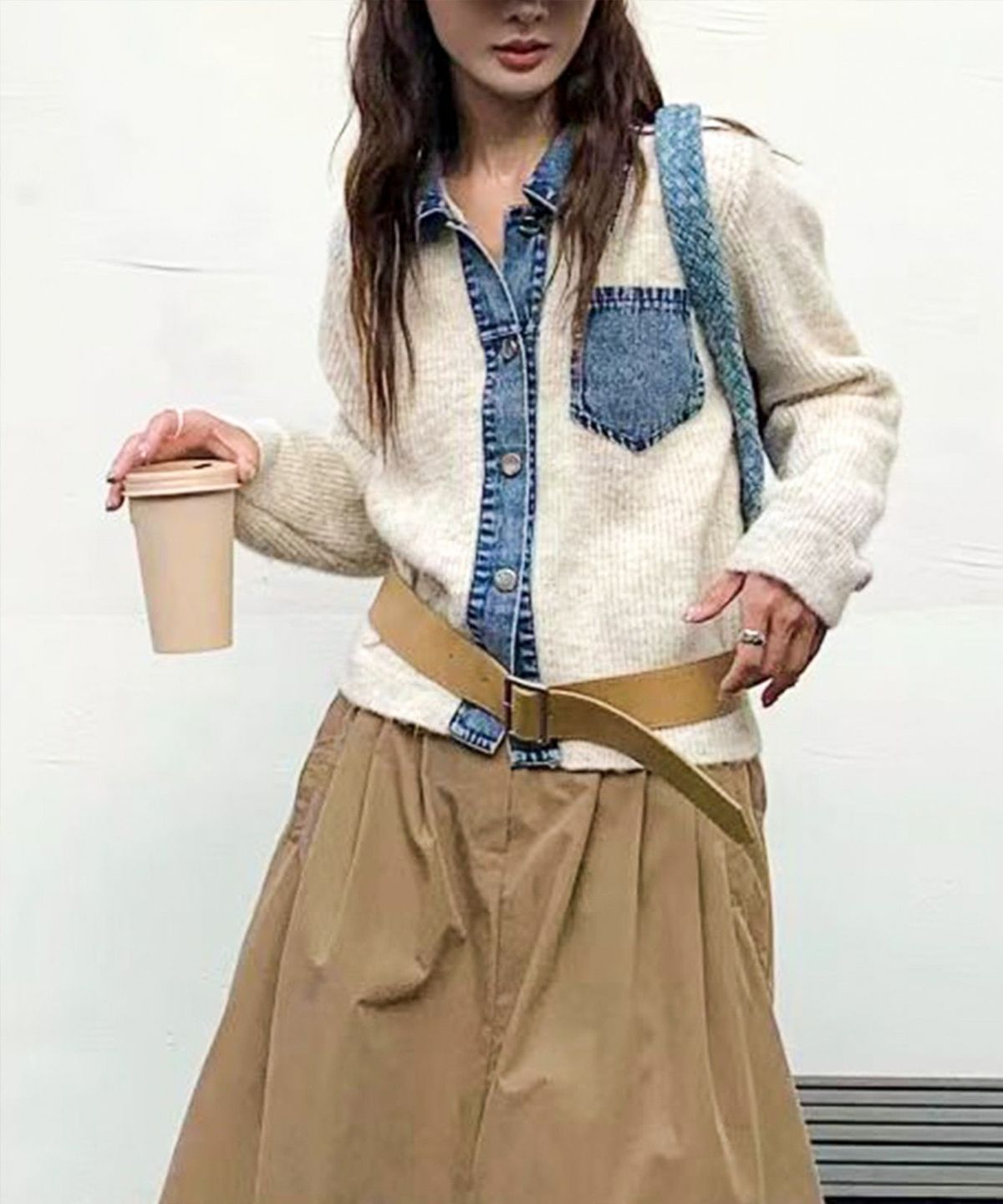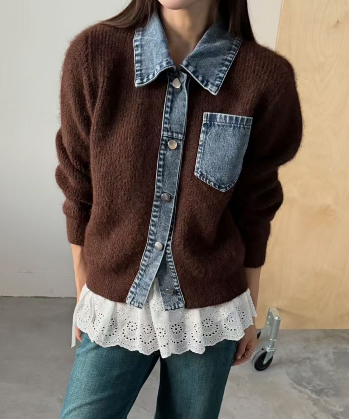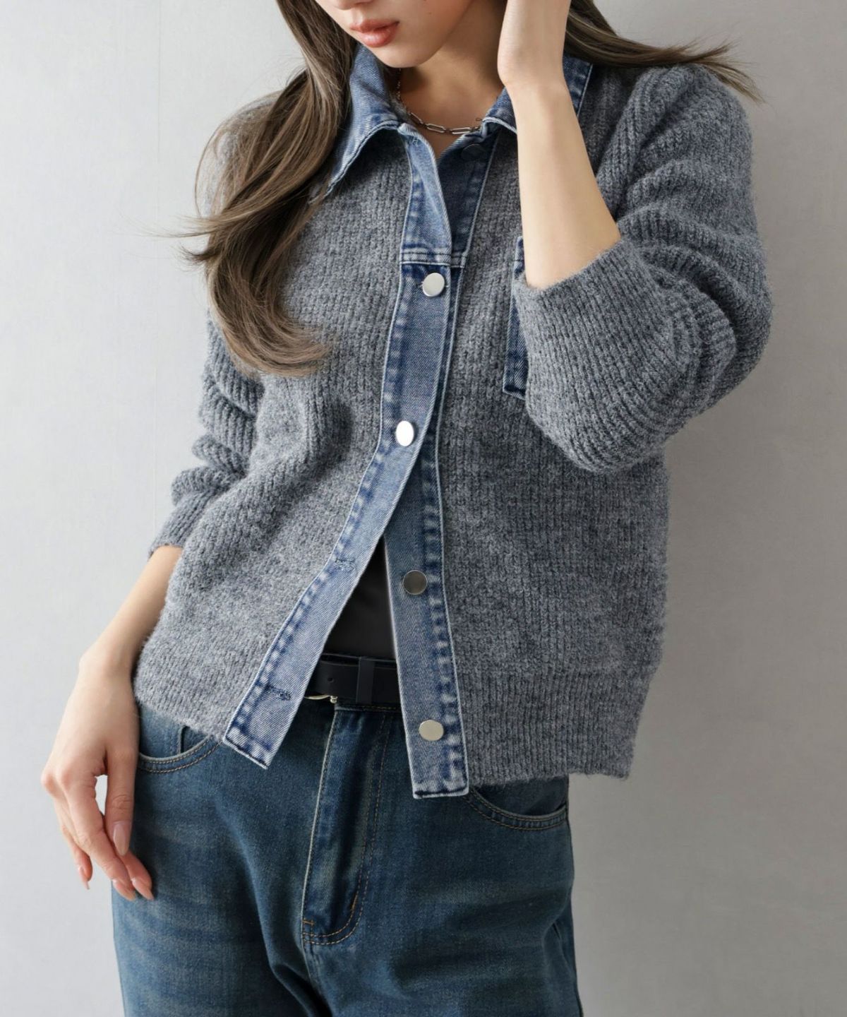 デニムポケット付き切替フェイクレイヤードカーディガン