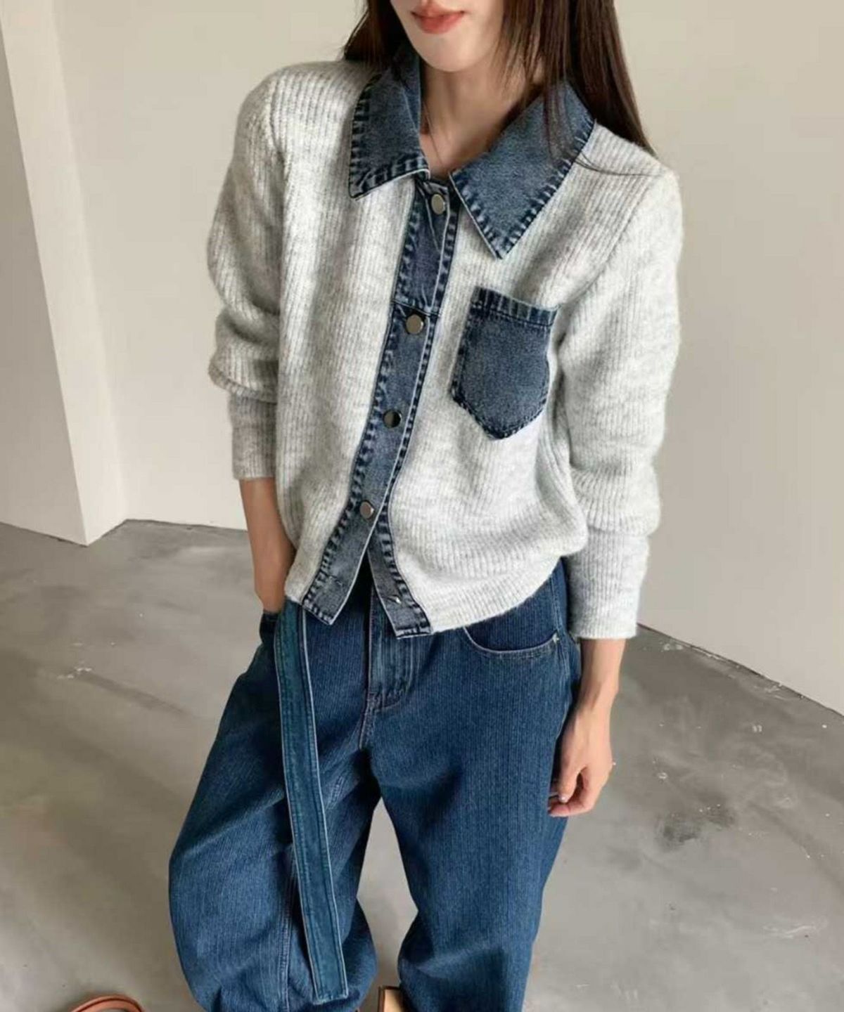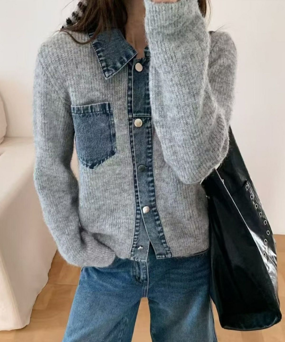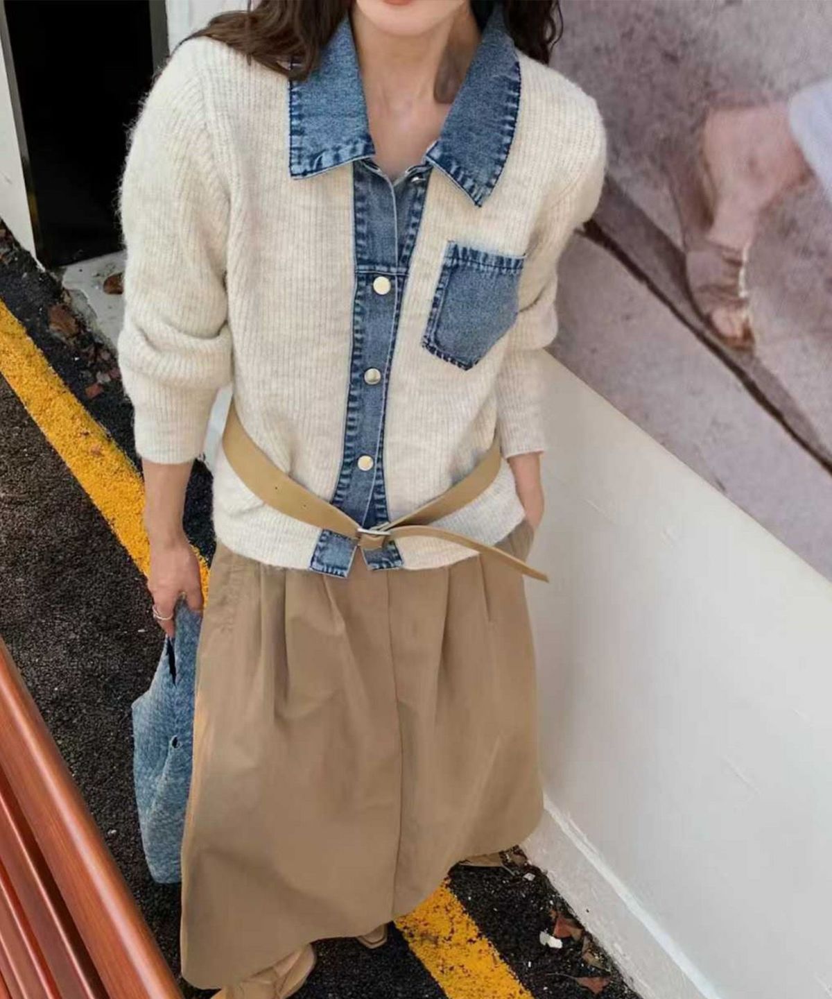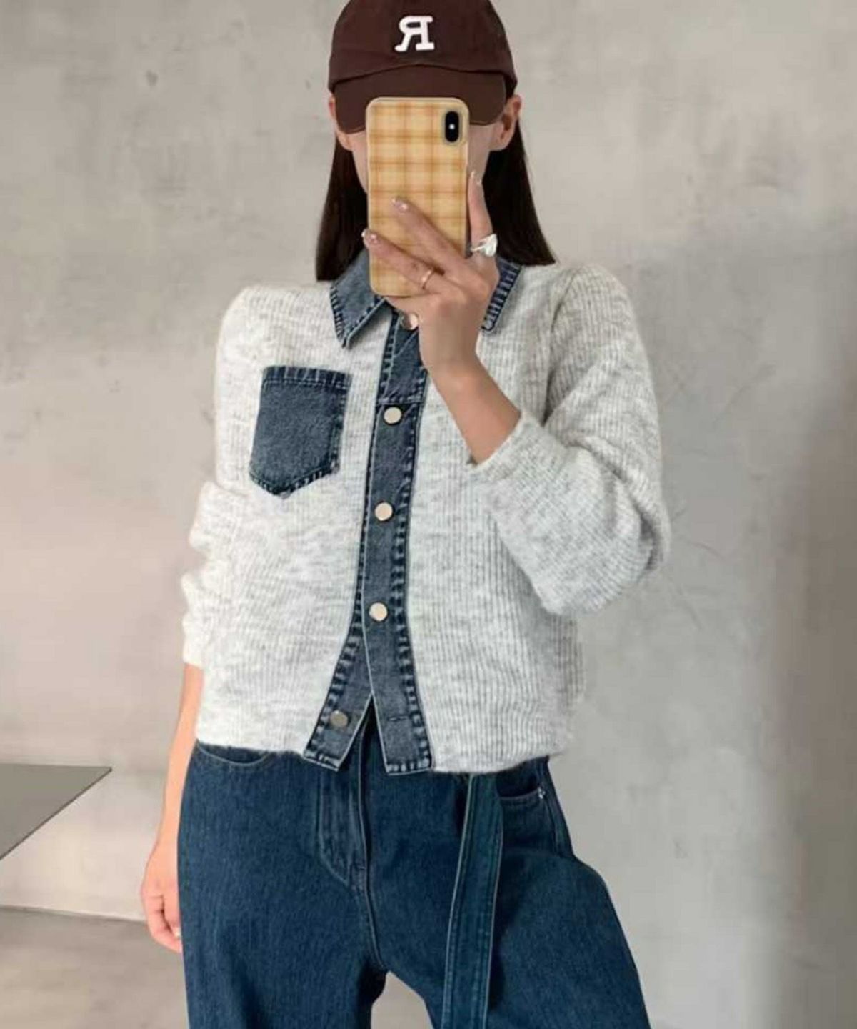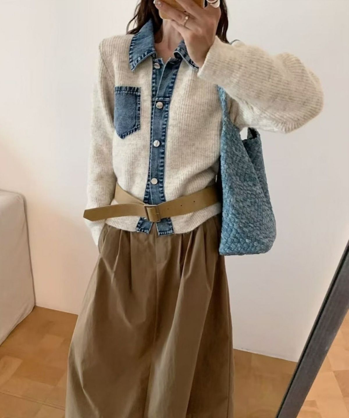 デニムポケット付き切替フェイクレイヤードカーディガン