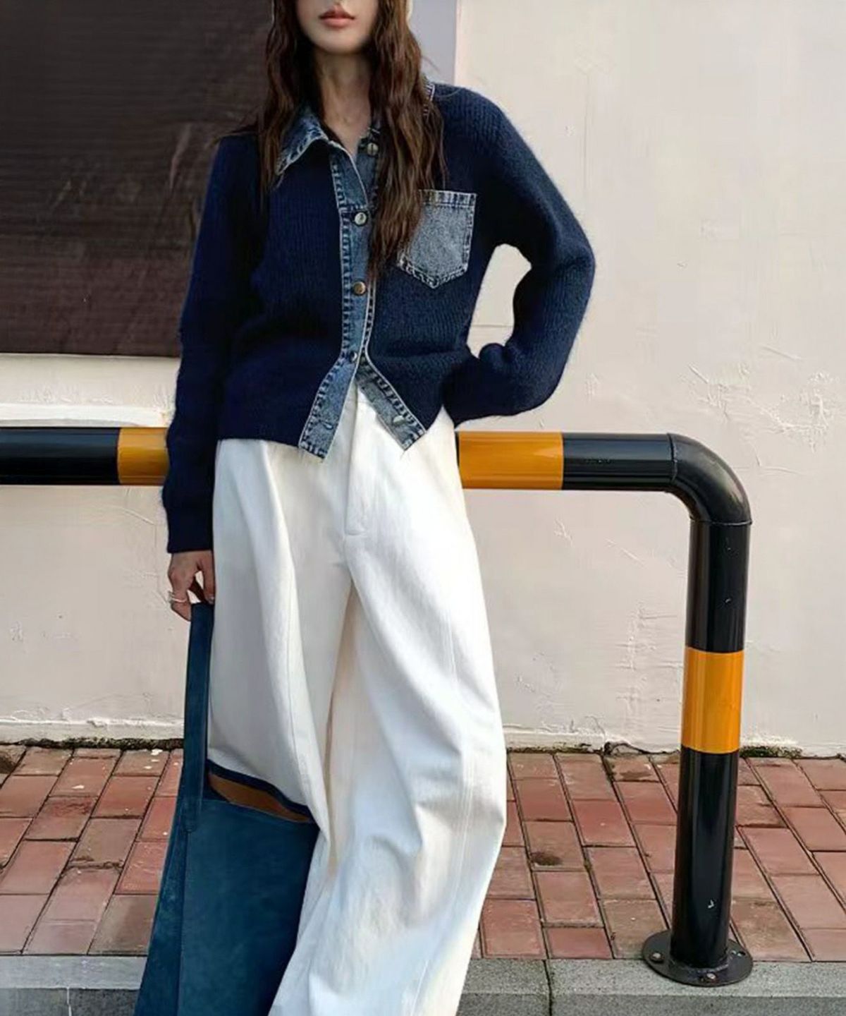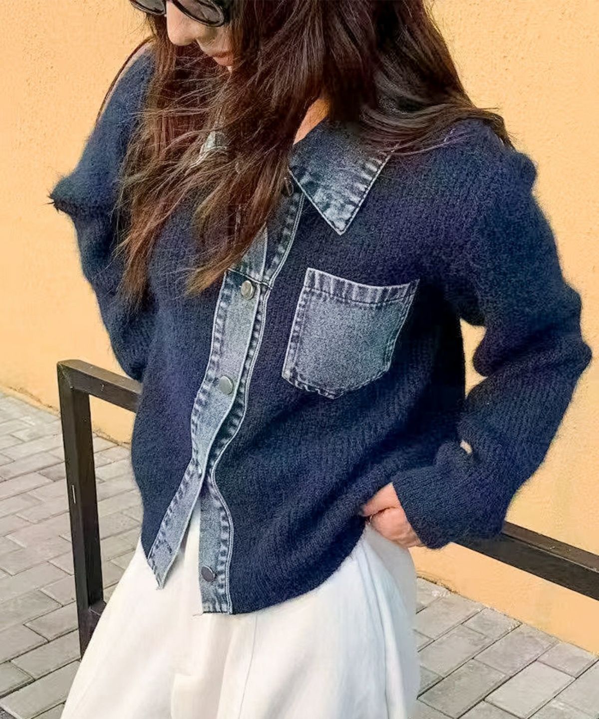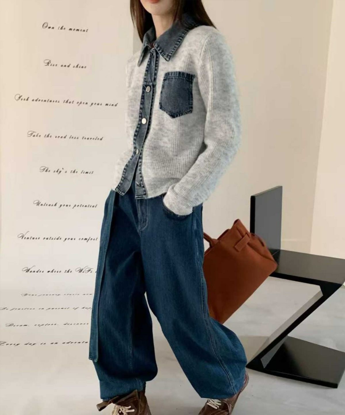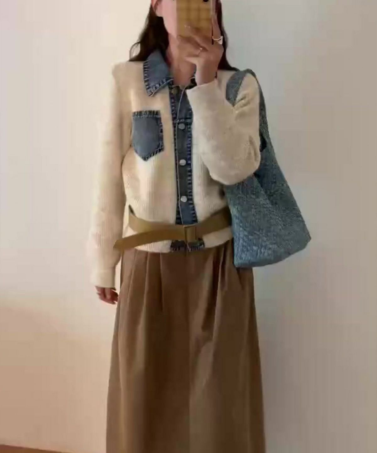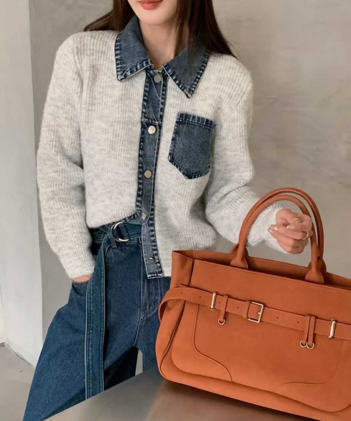 デニムポケット付き切替フェイクレイヤードカーディガン