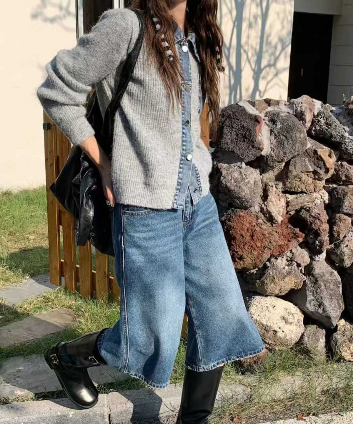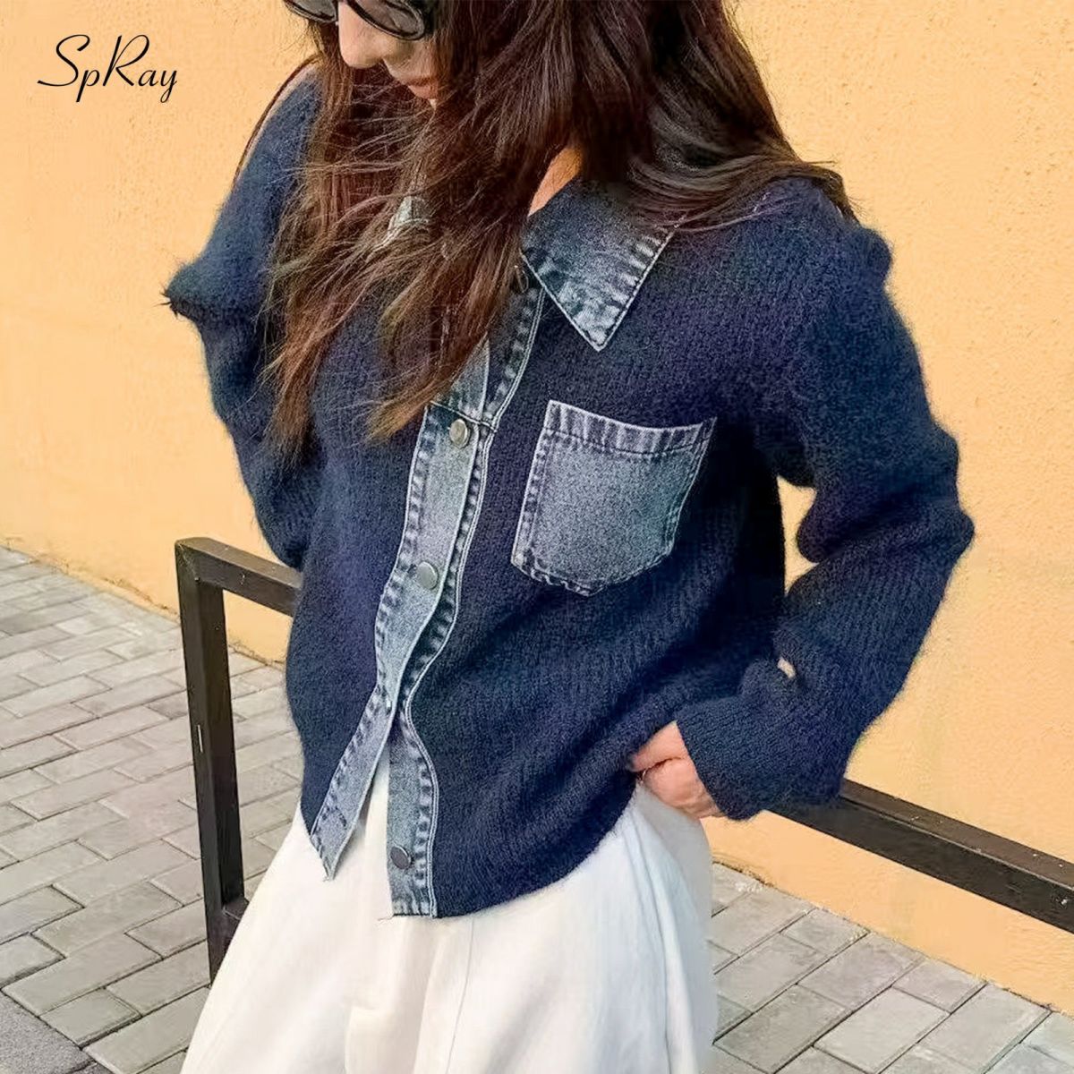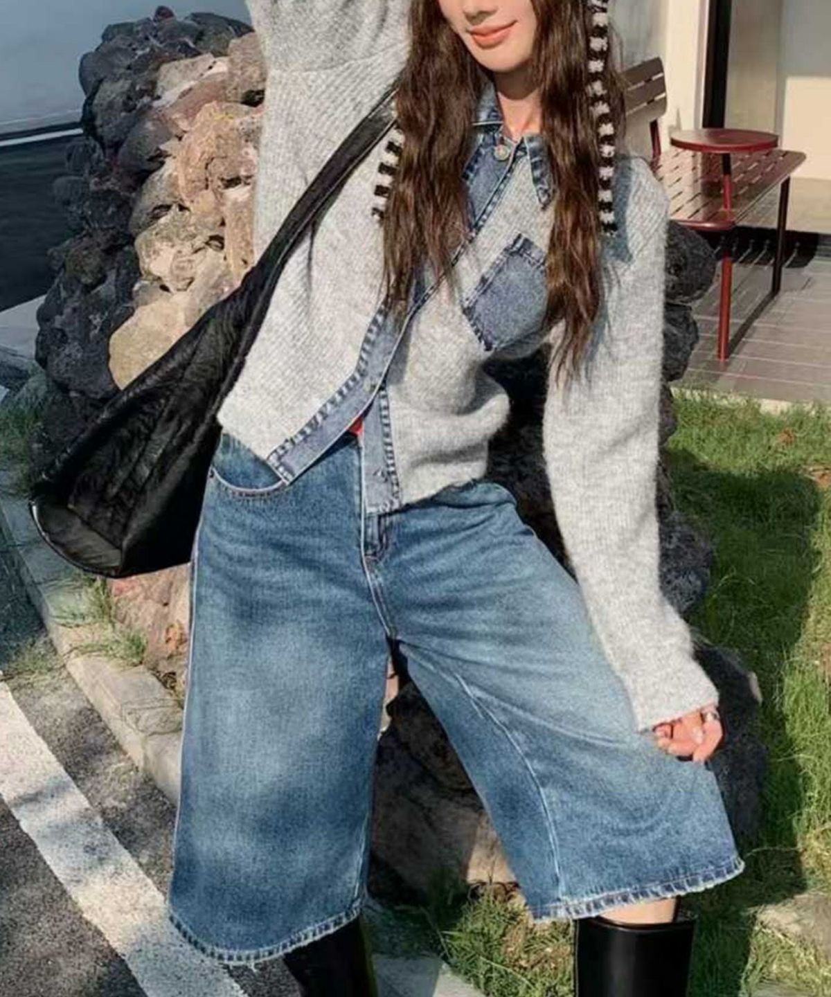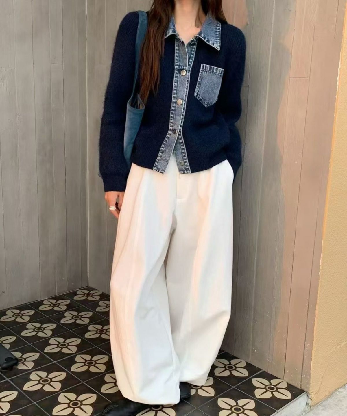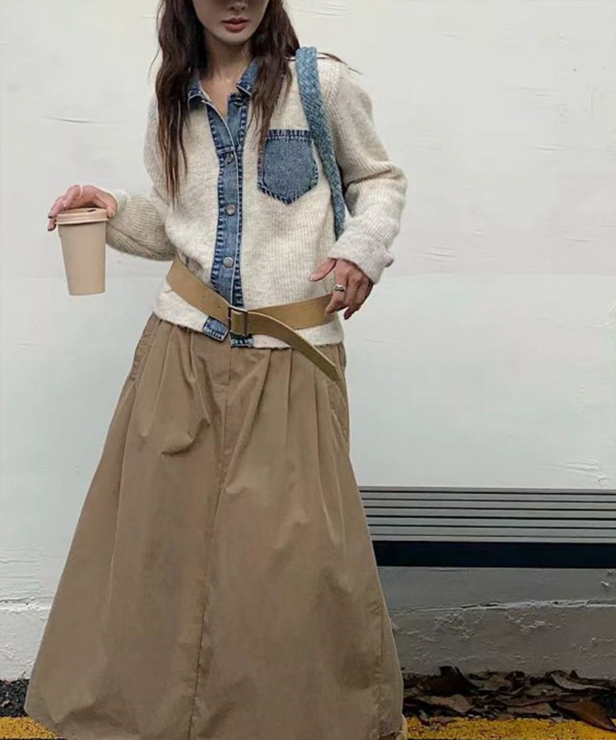 デニムポケット付き切替フェイクレイヤードカーディガン
