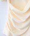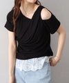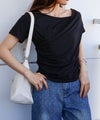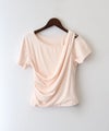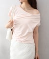 フロントの流れるようなドレープとサイドのシャーリングが、女性らしい立体的なシルエットを演出します。広めのネックラインはデコルテを美しく見せ、オフショルダーとしても着用可能。ストレッチ素材で、デイリーから華やかなシーンまで着心地よく彩る一着です。