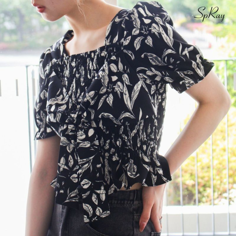 【SpRay 花柄シャーリングリボンショートスリーブブラウス】