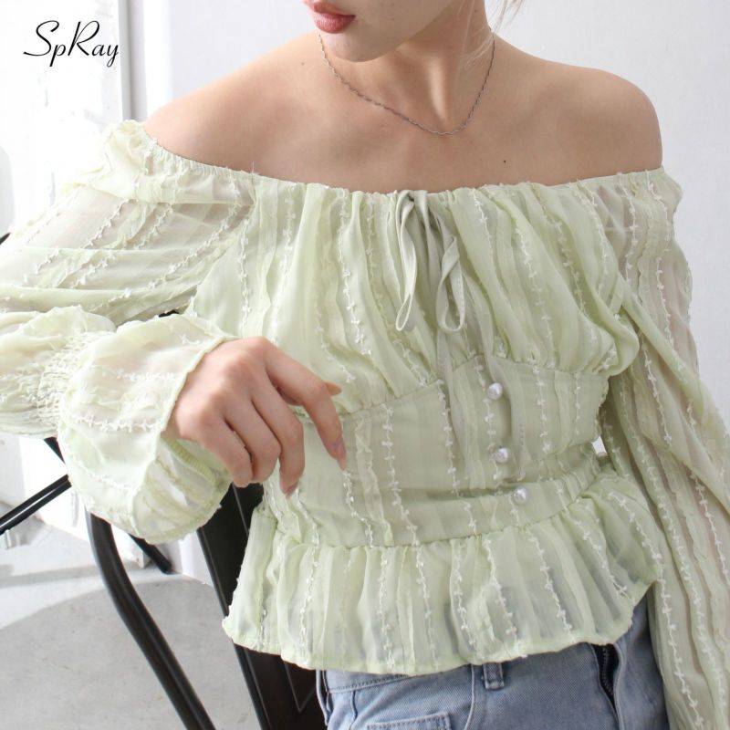 襟ぐりにゴムが入っているのでオフショルダーにも変更可能なブラウスが登場。