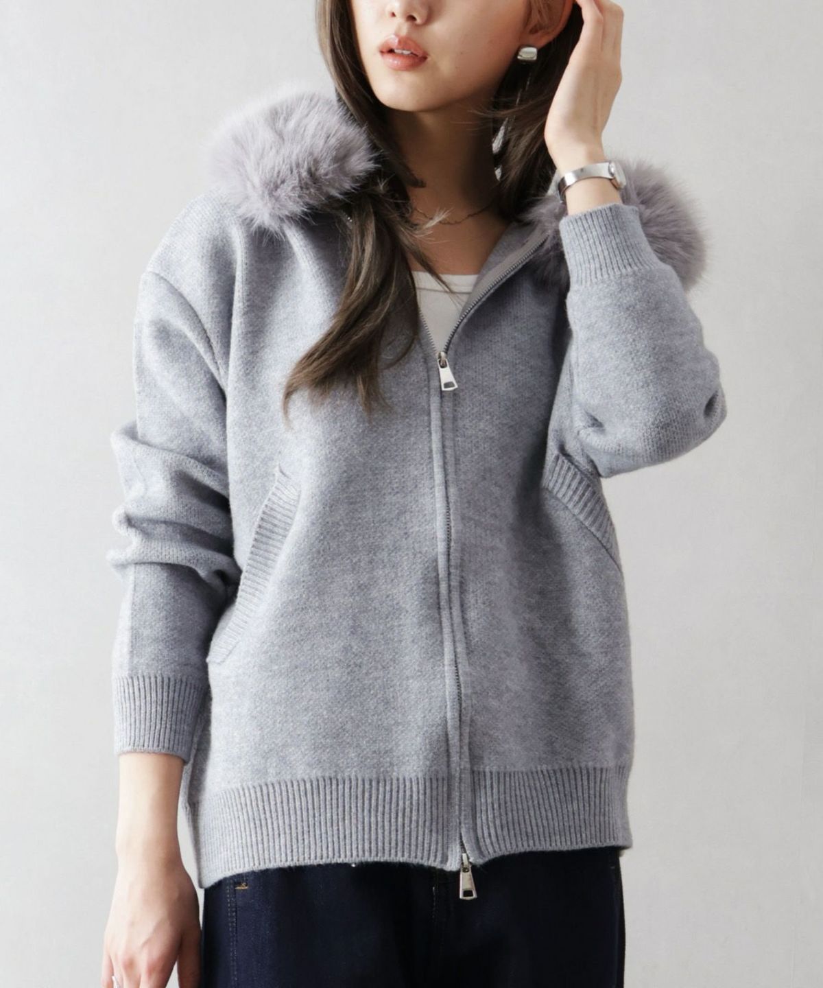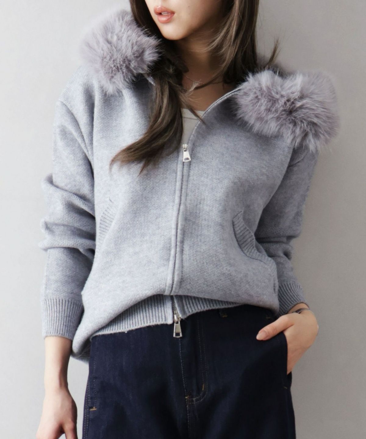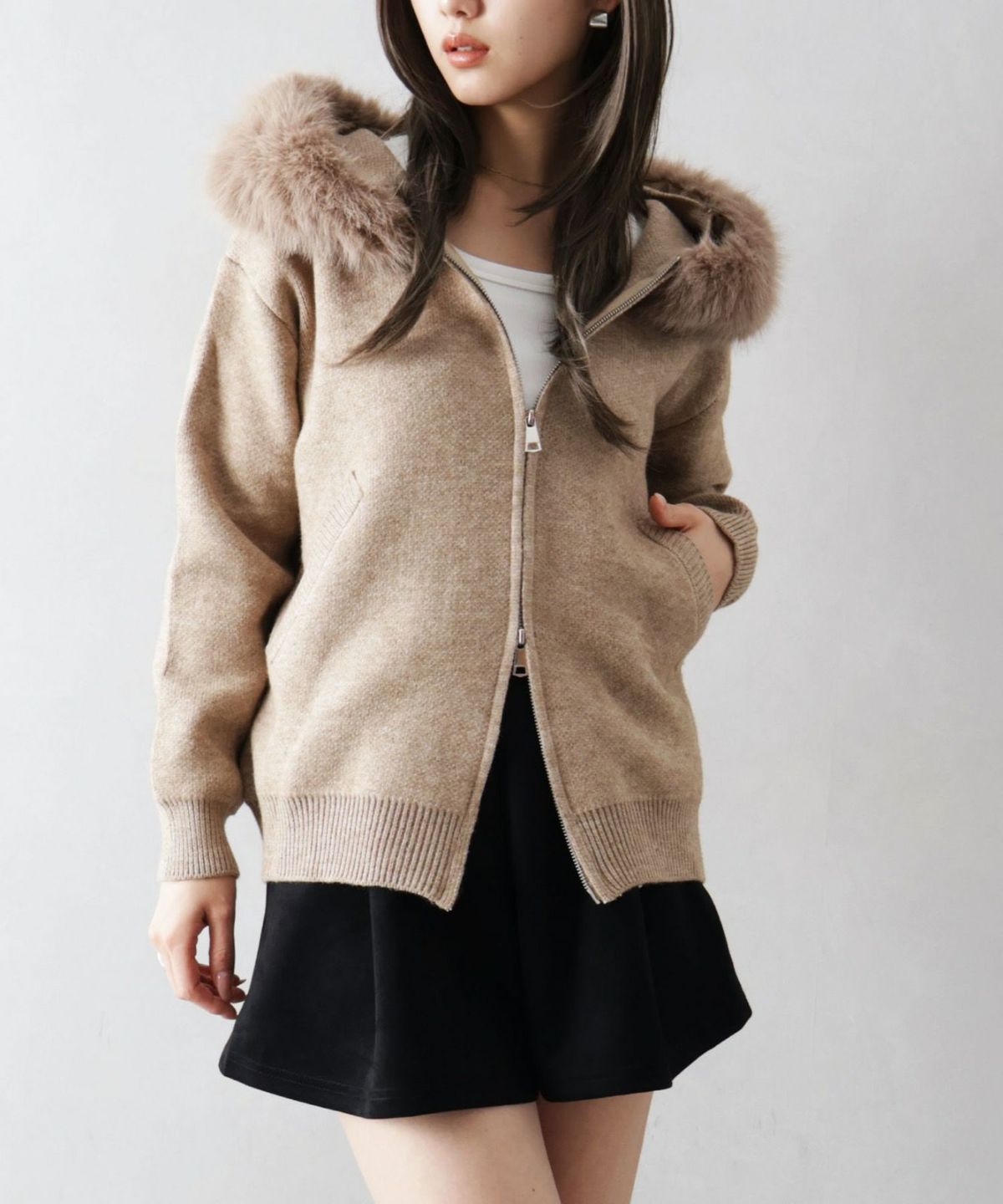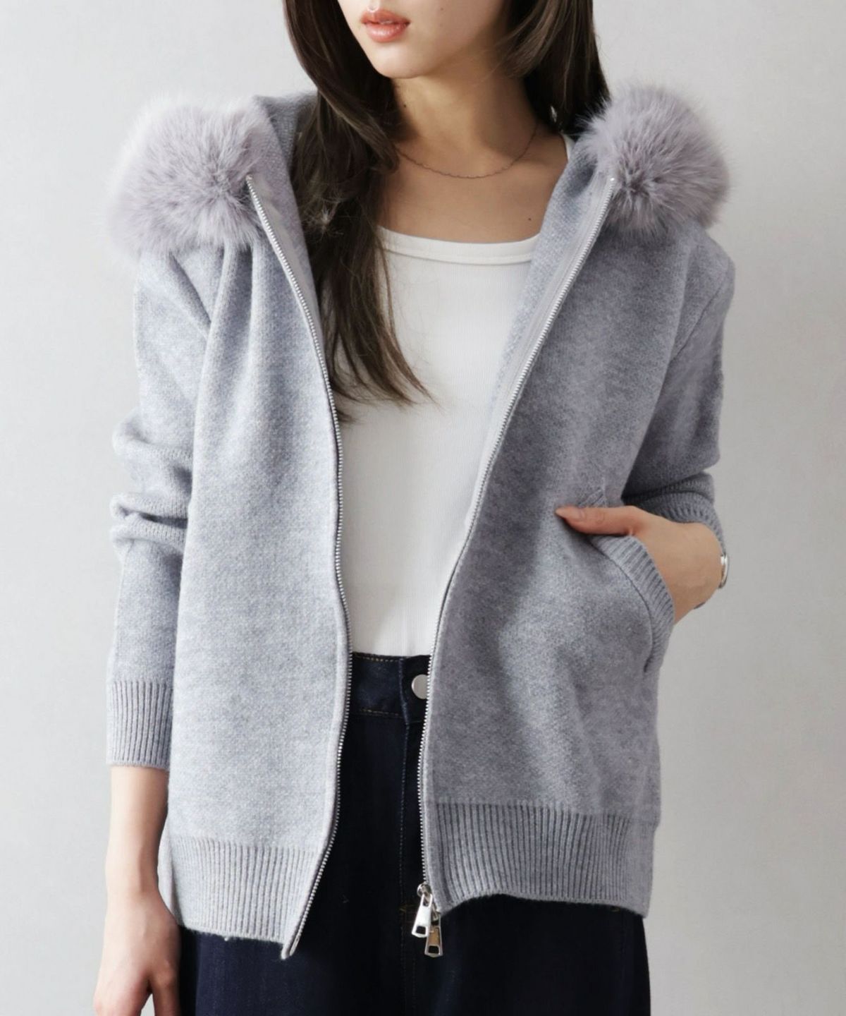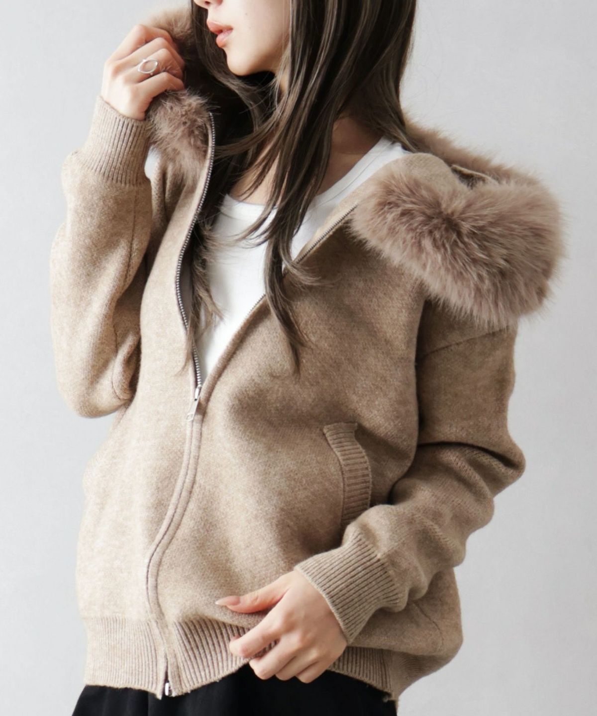 ファー付ニットロングジップパーカー