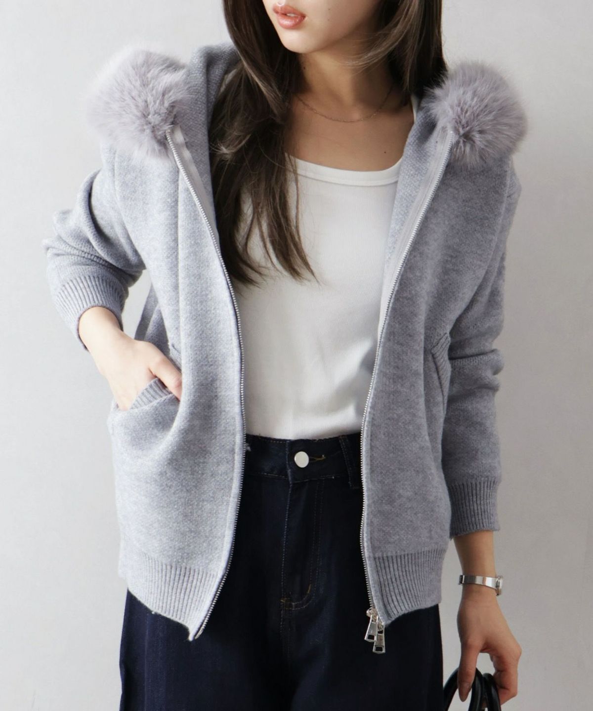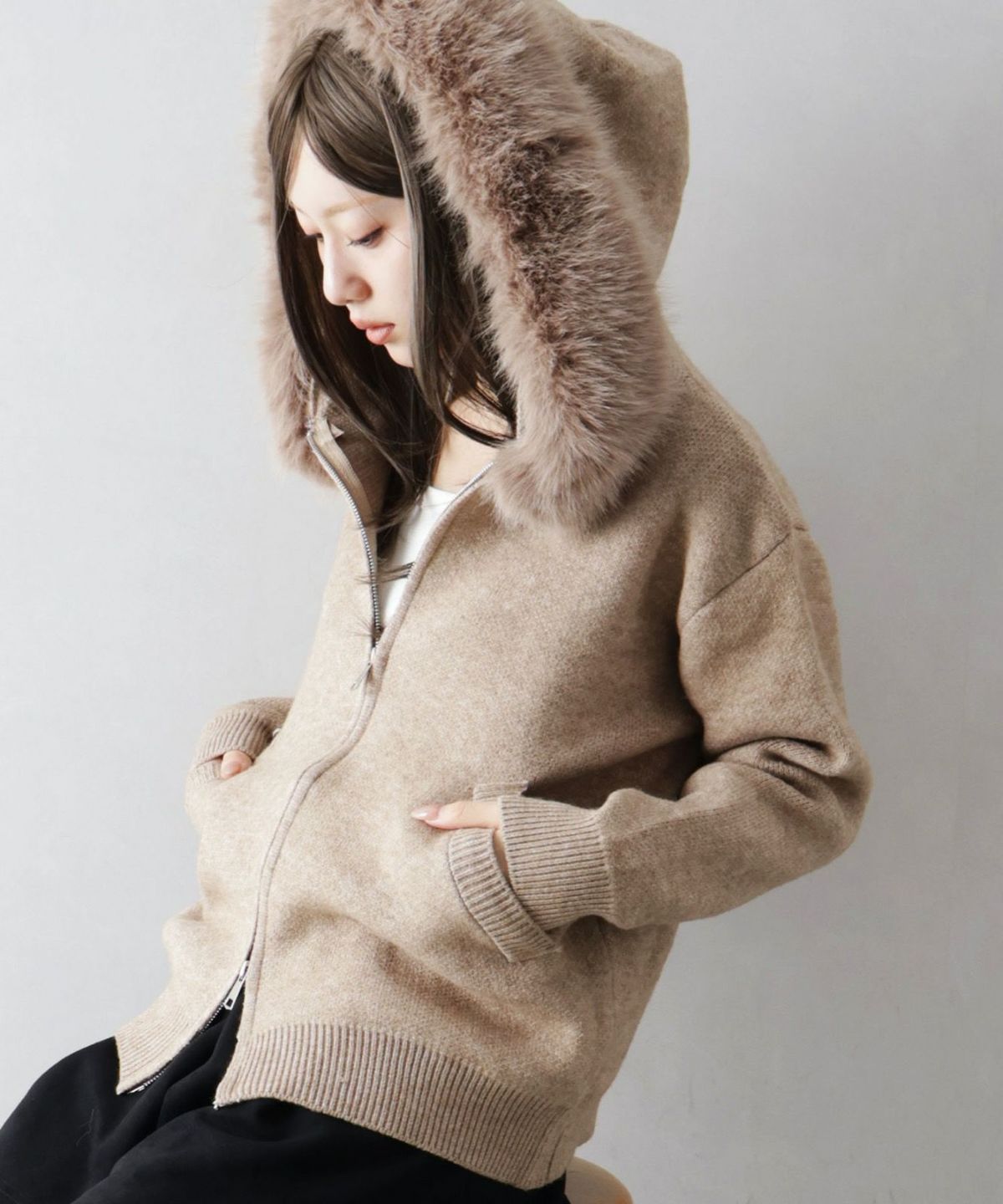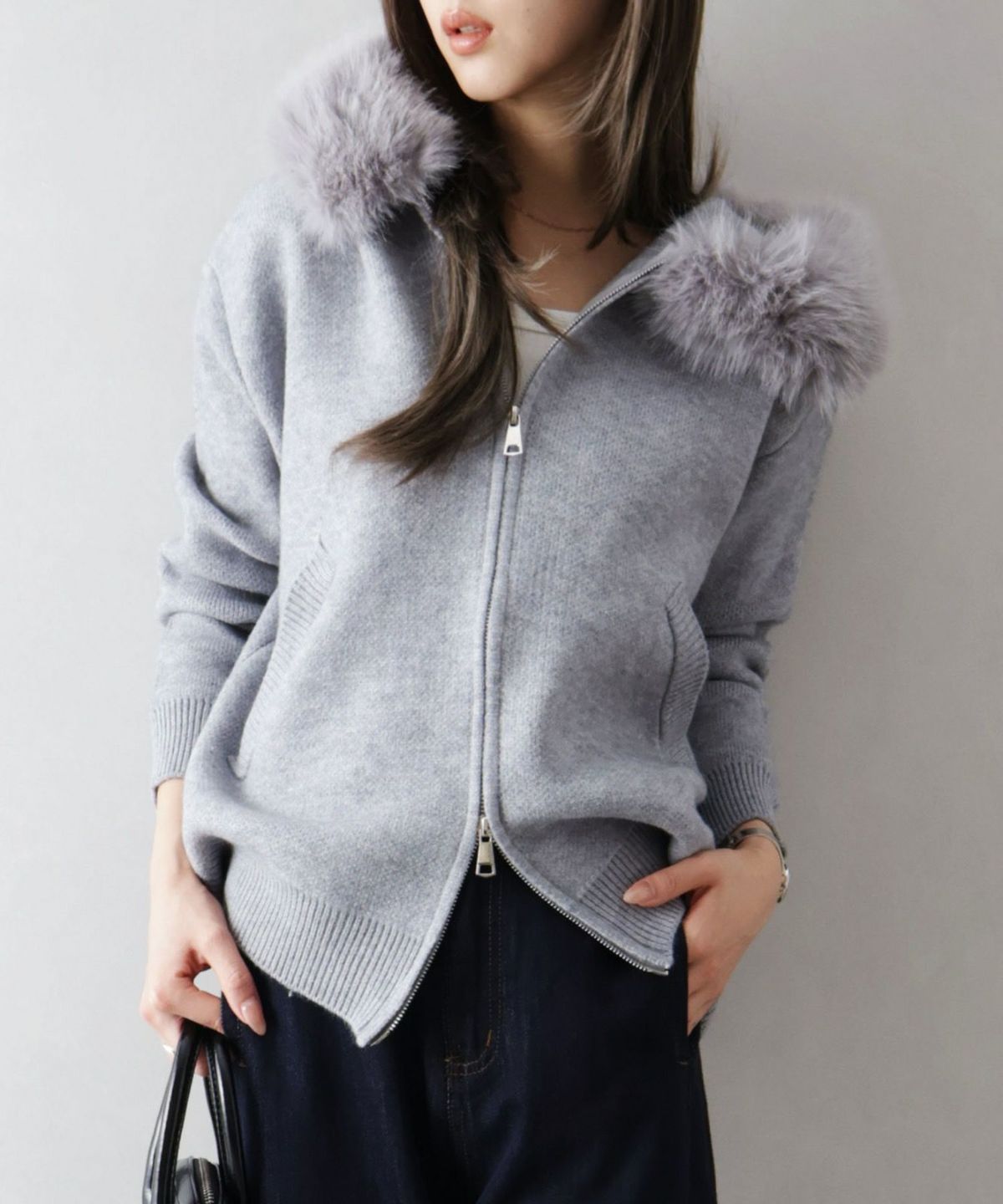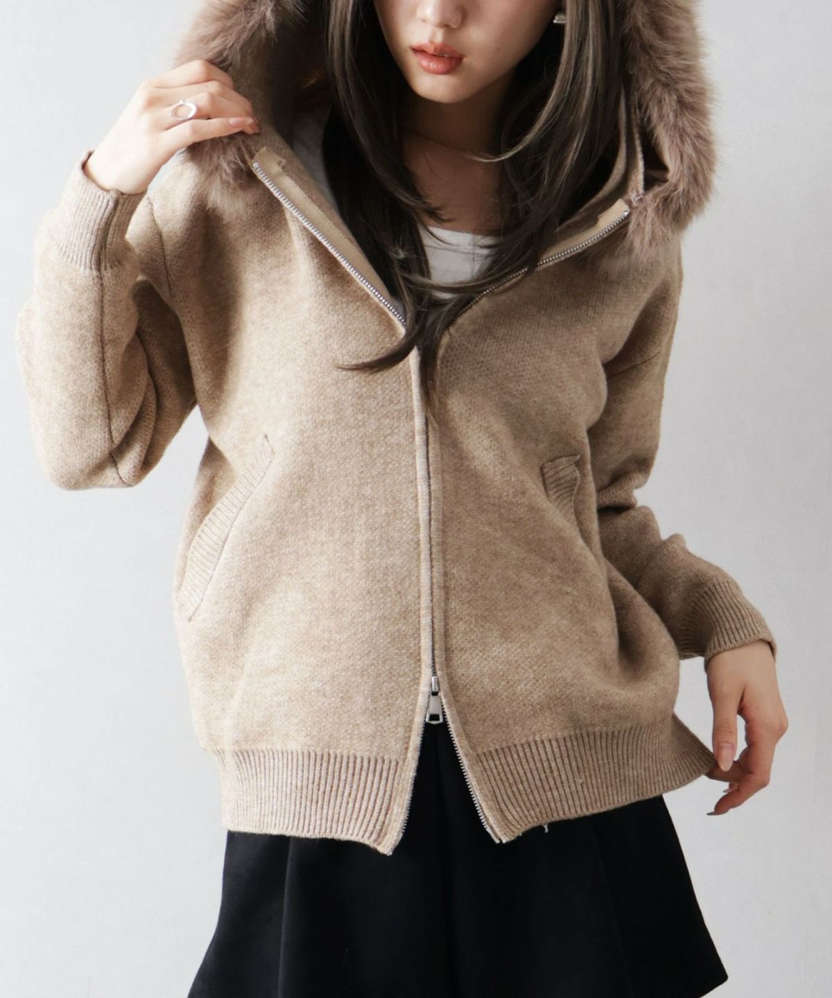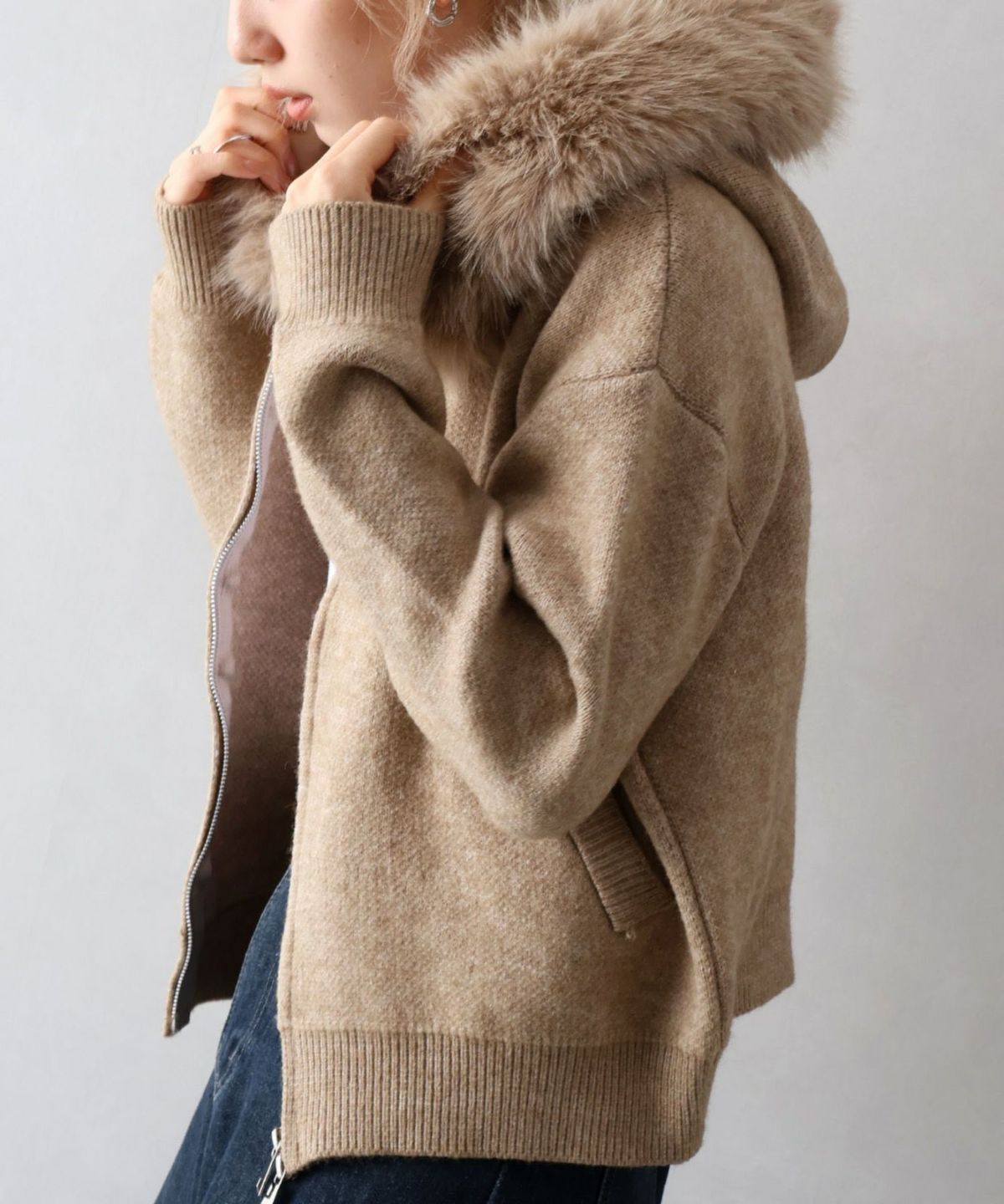 ファー付ニットロングジップパーカー