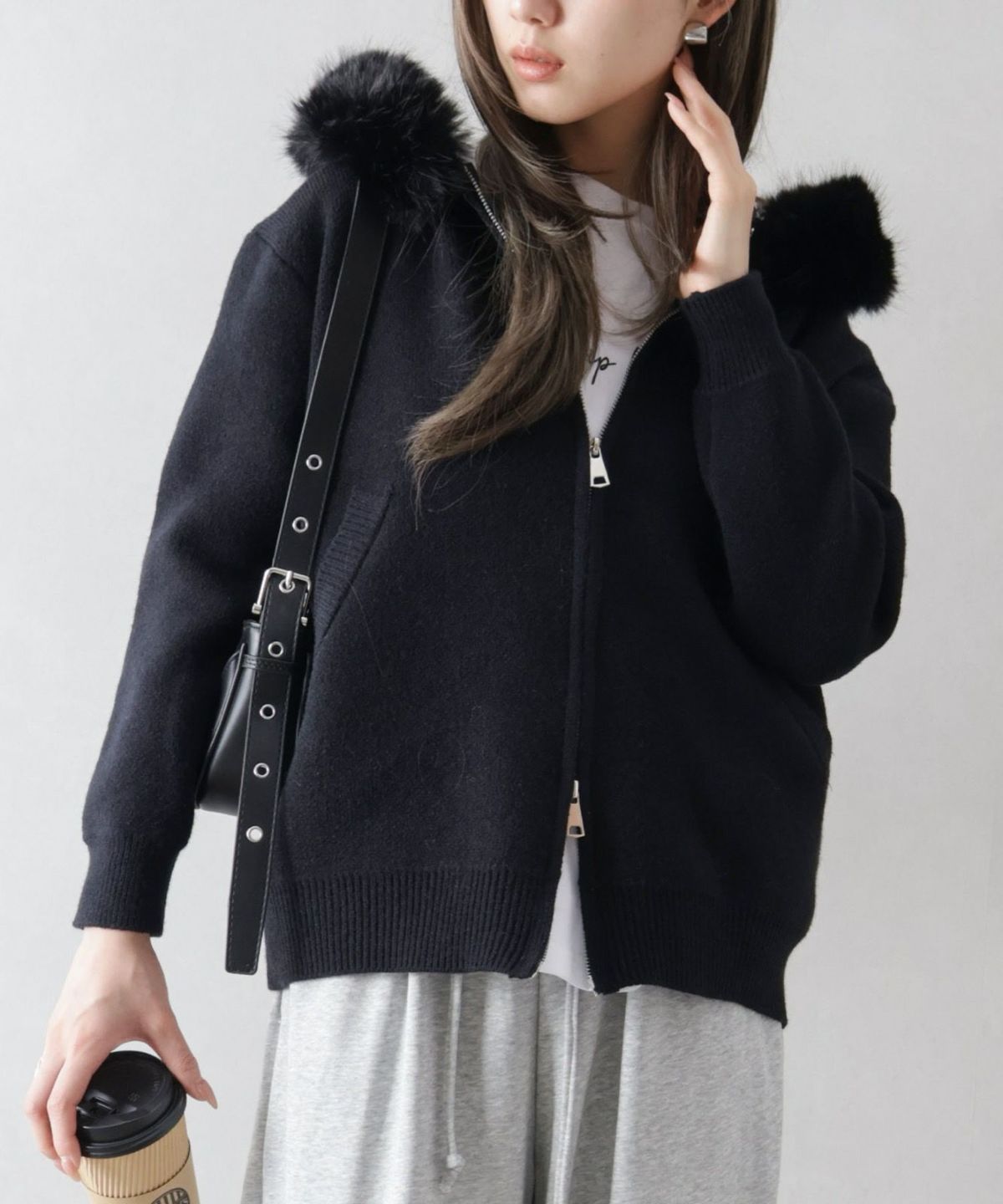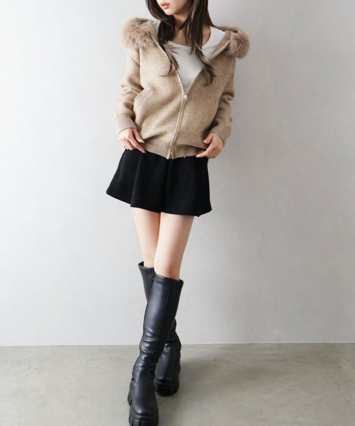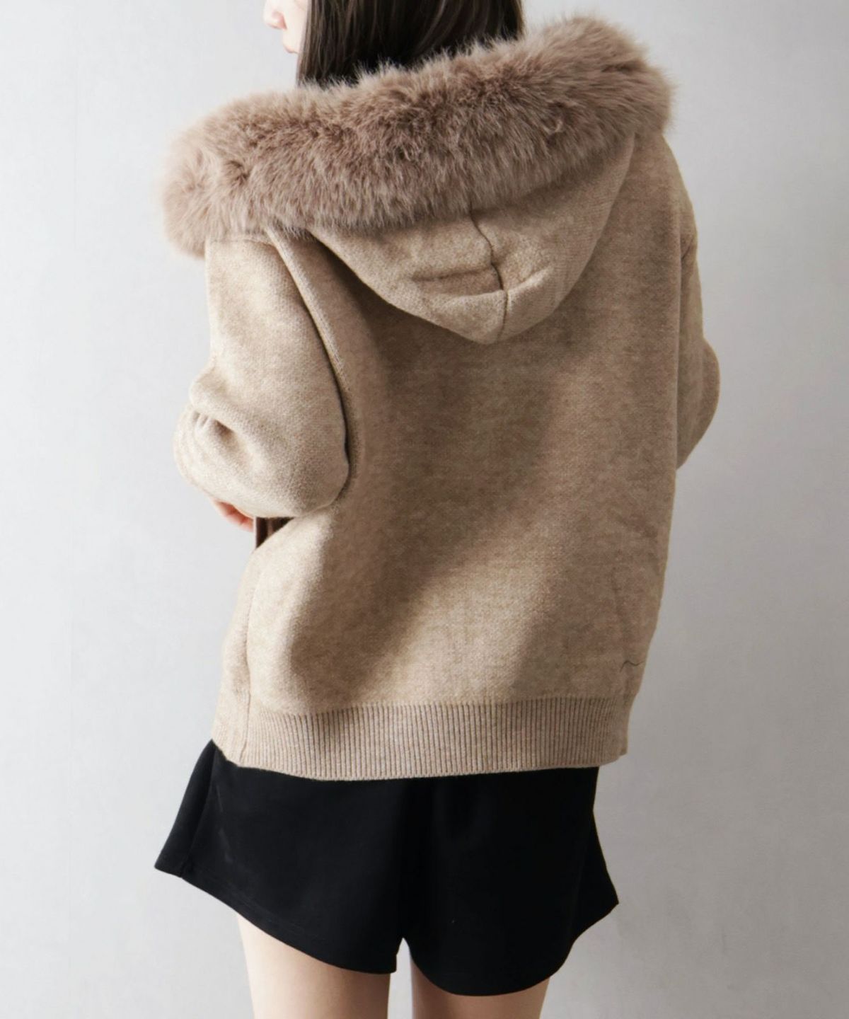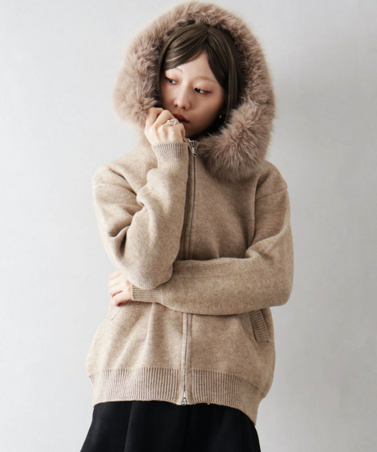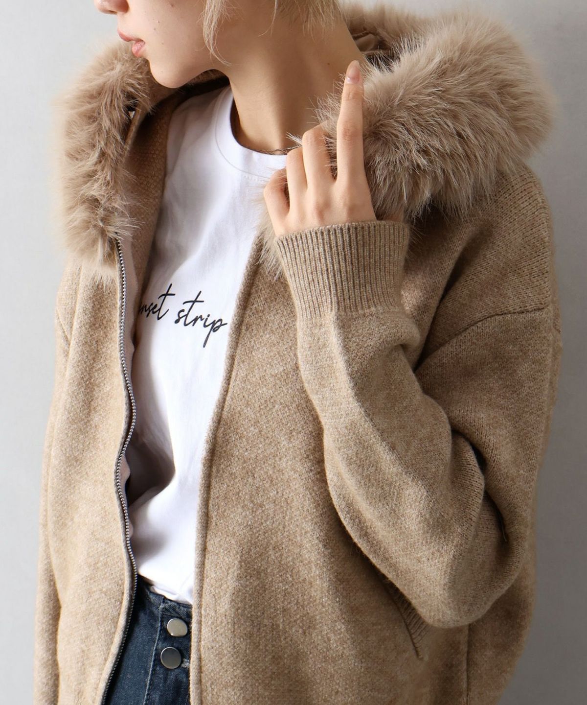 ファー付ニットロングジップパーカー