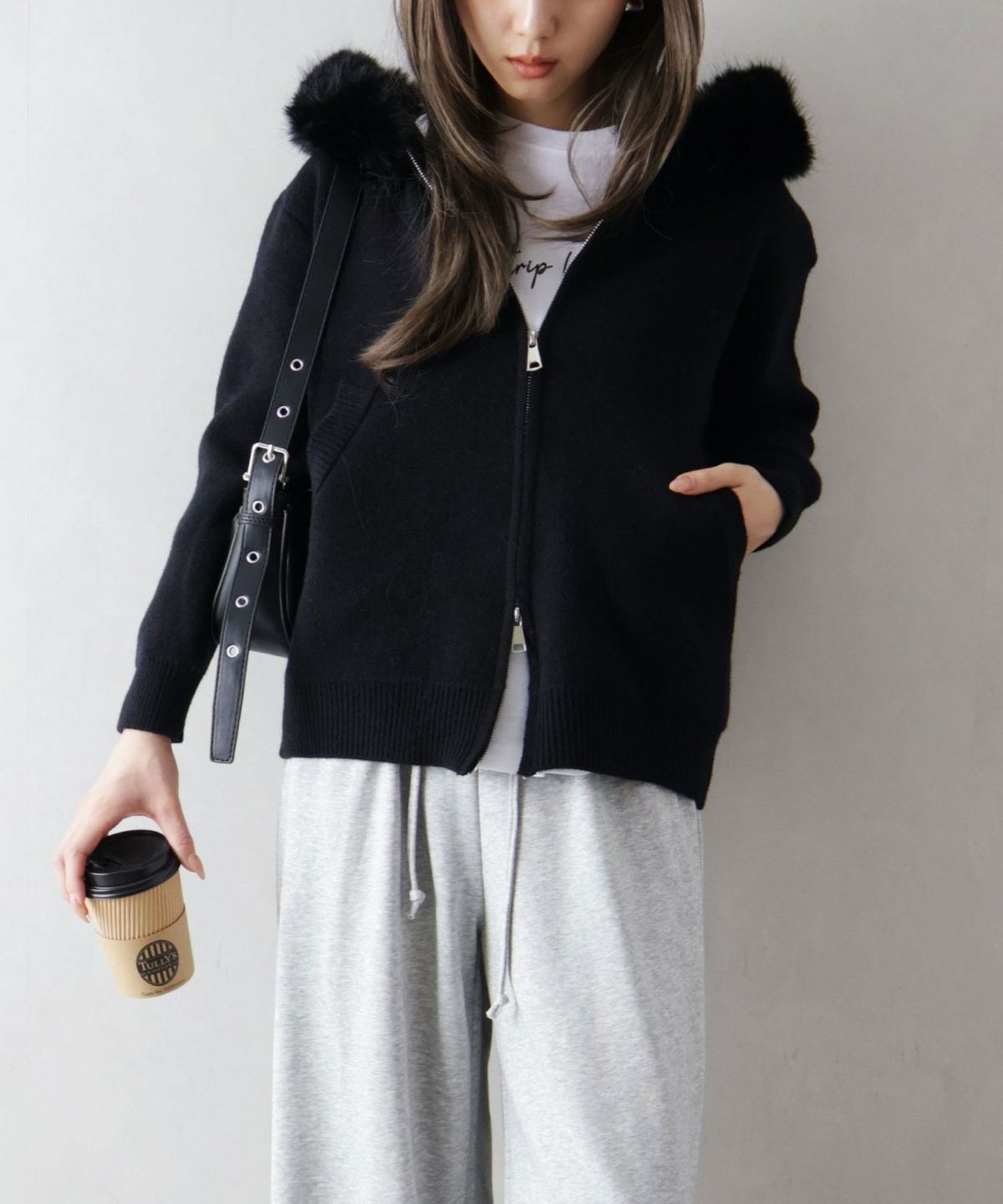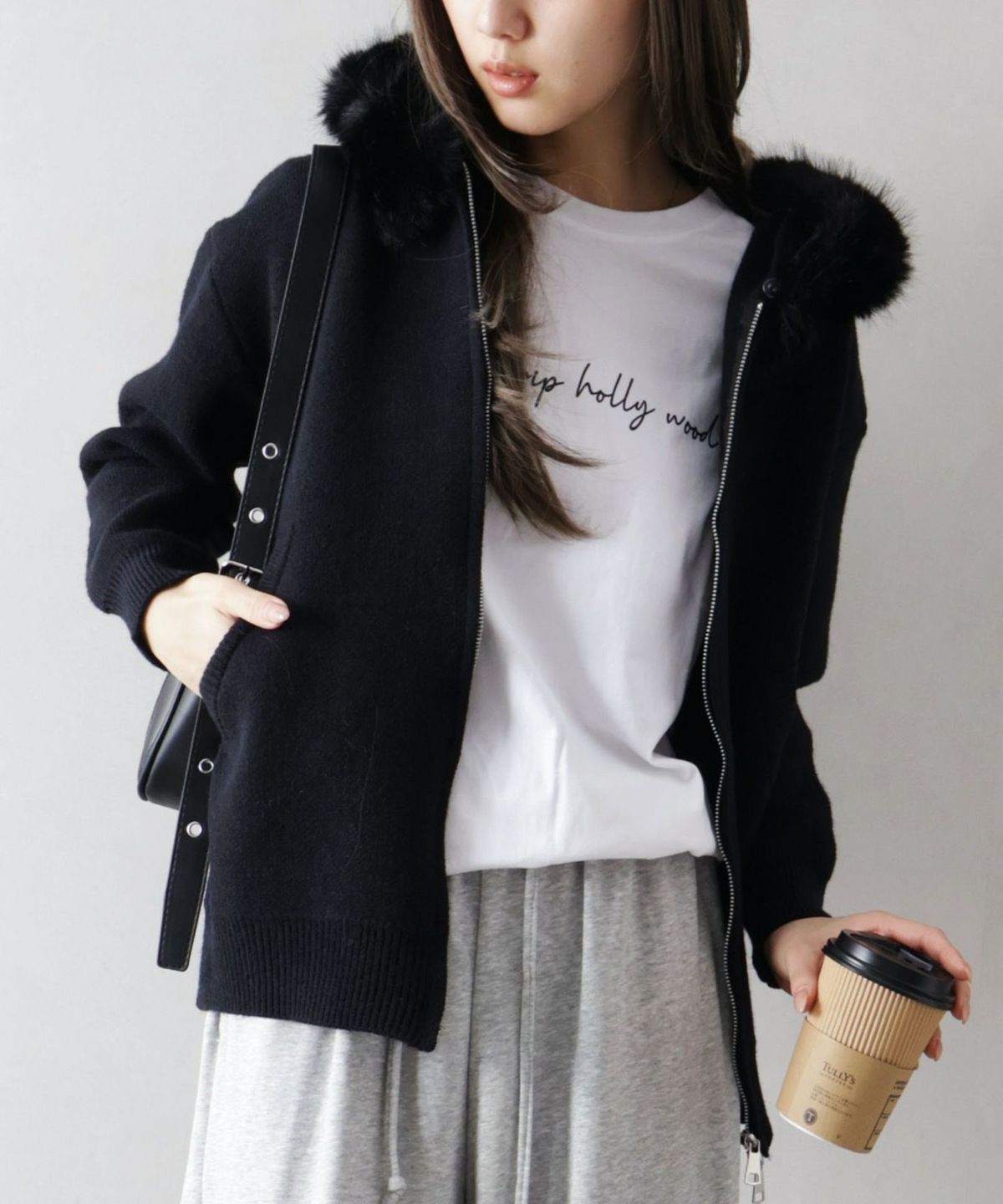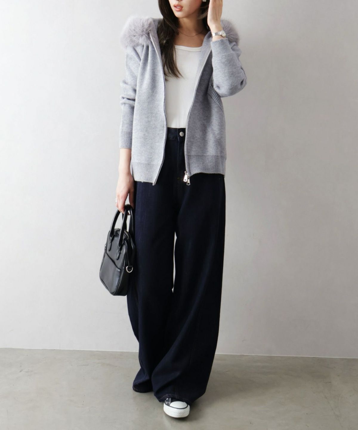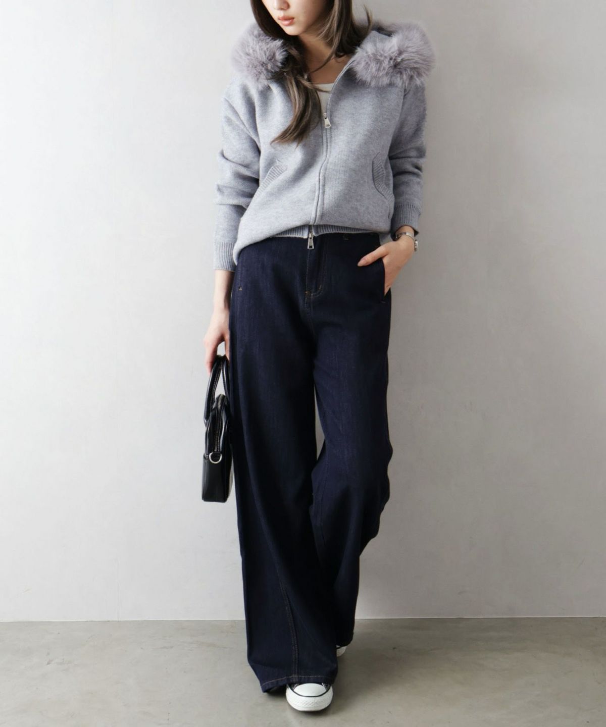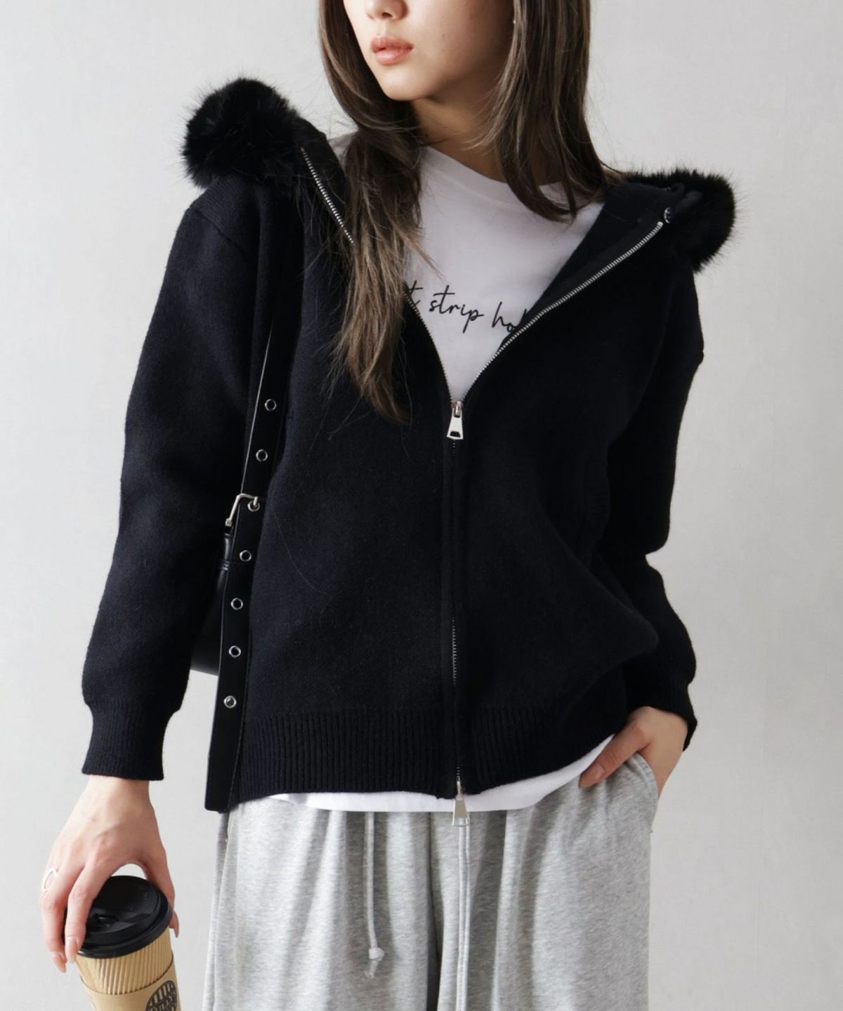 ファー付ニットロングジップパーカー