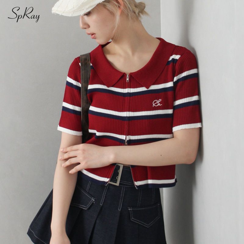 【SpRay ダブルジップボーダーショートスリーブニット】
