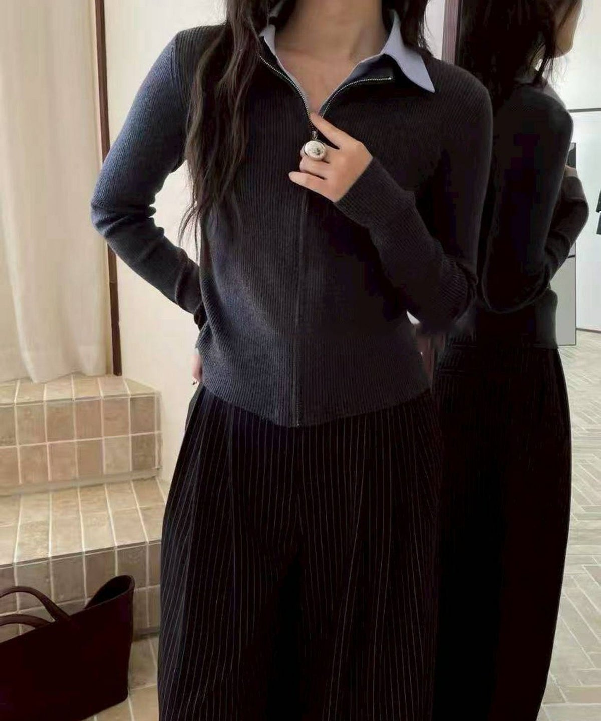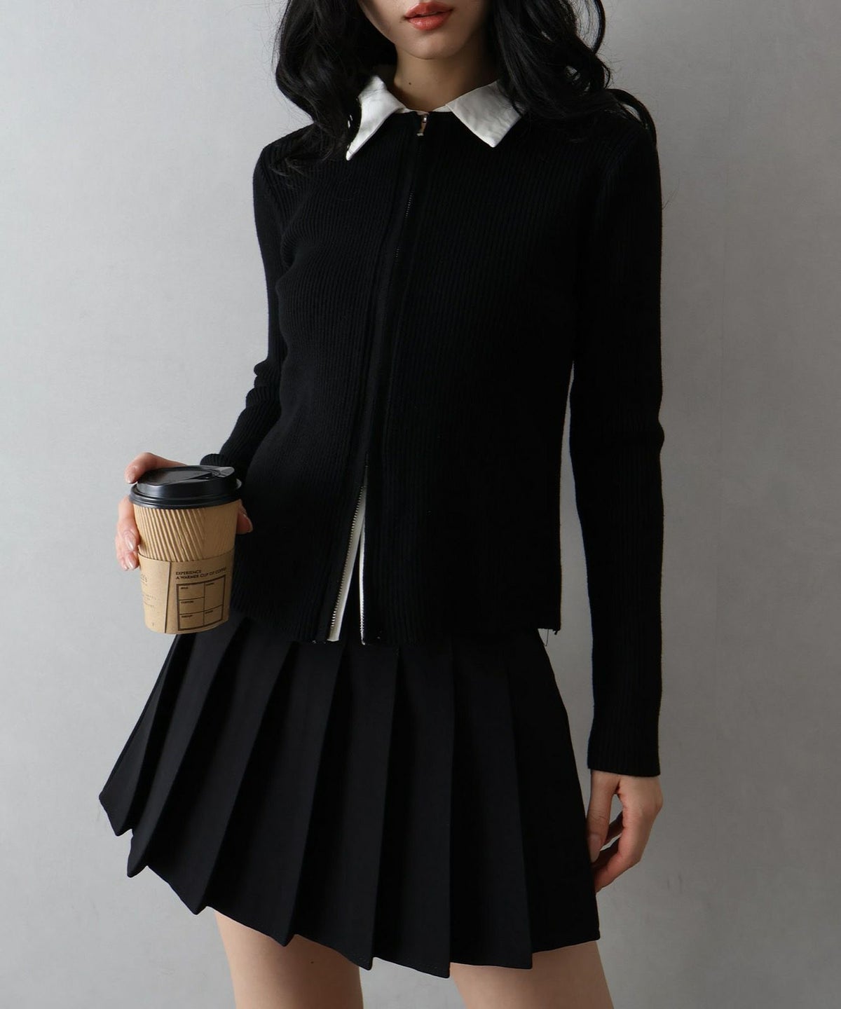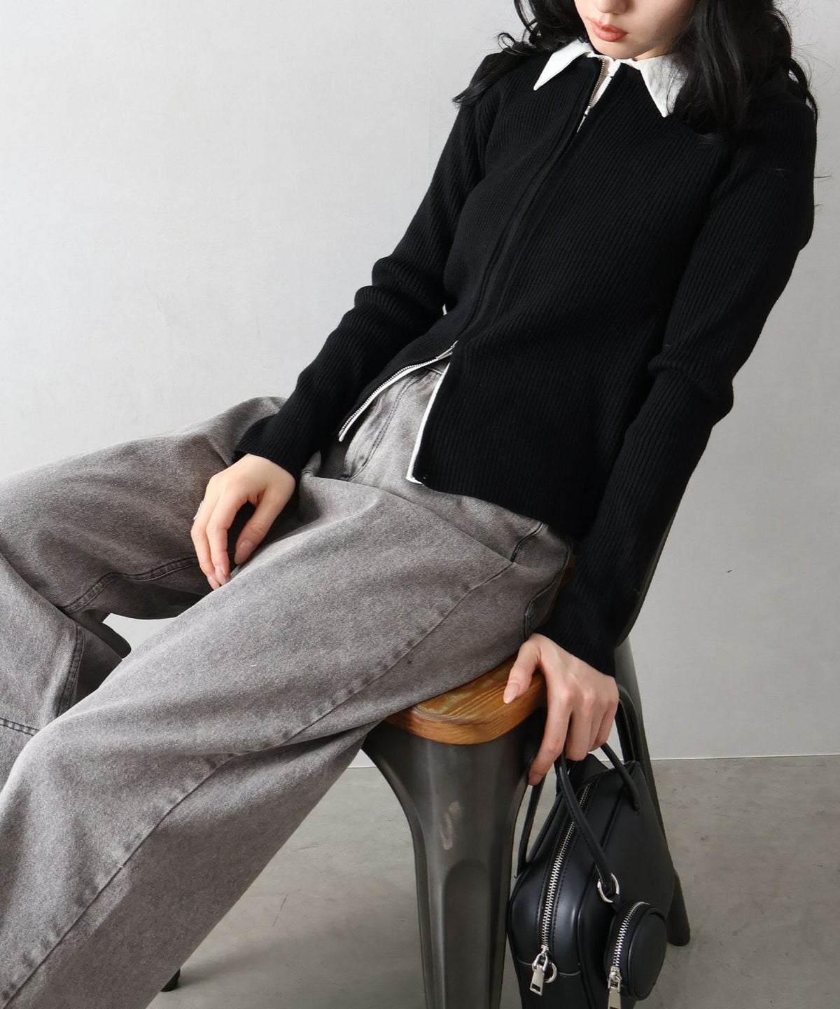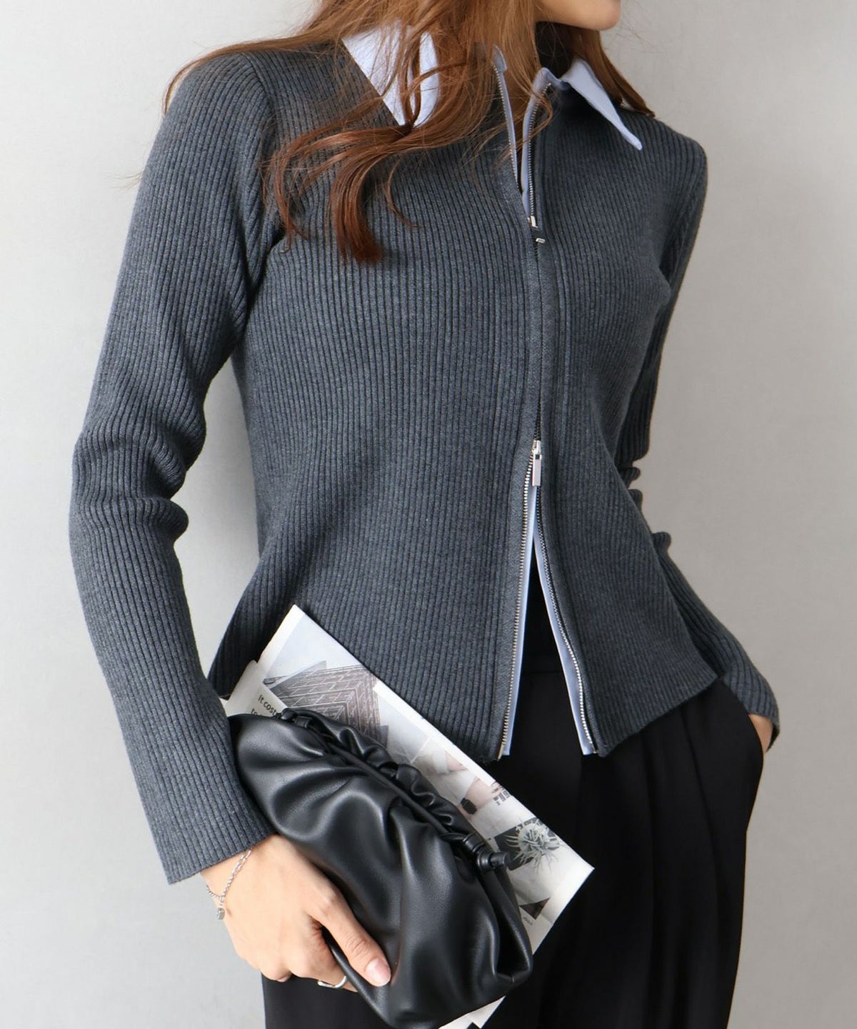 布帛チェック切替ダブルジップカーディガン
