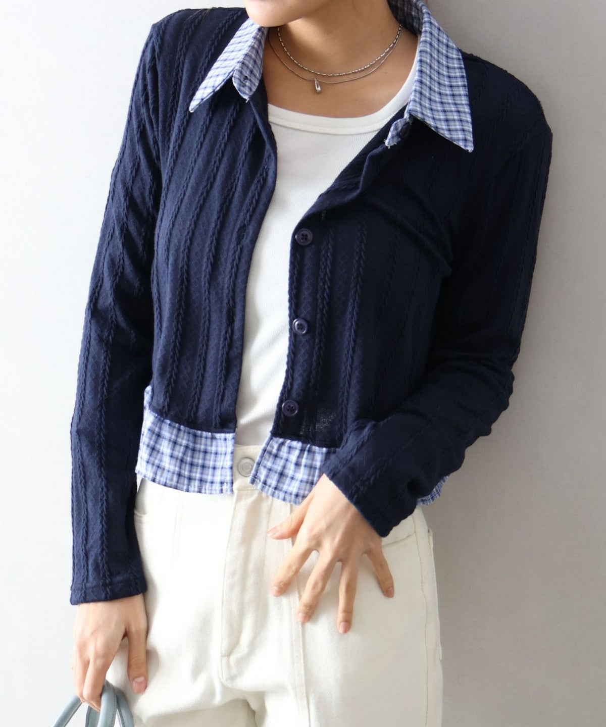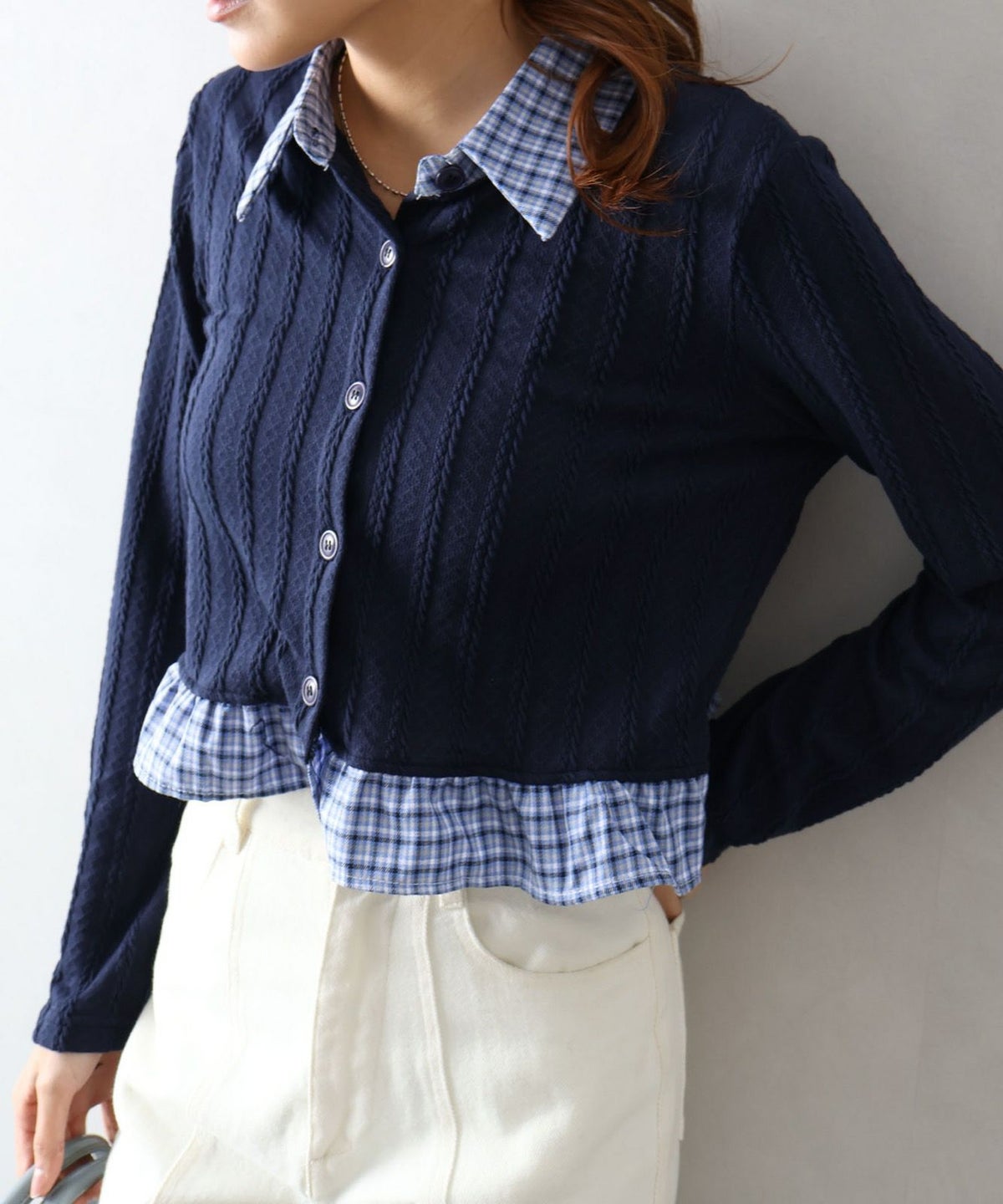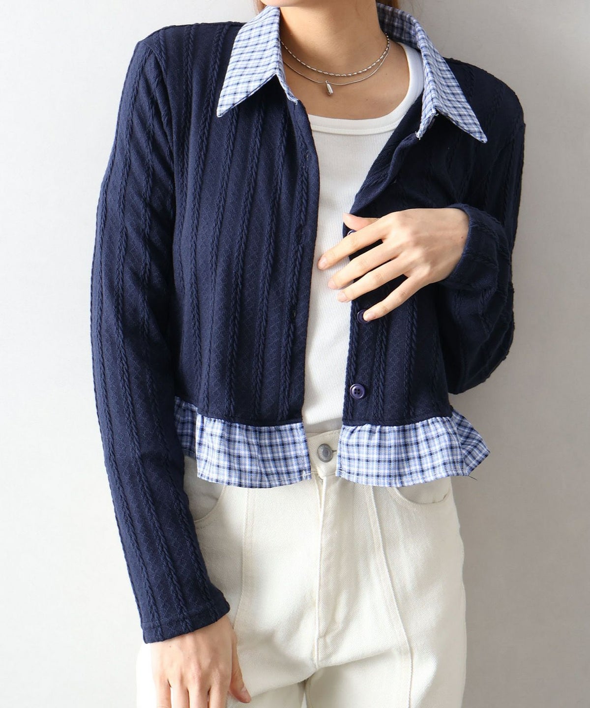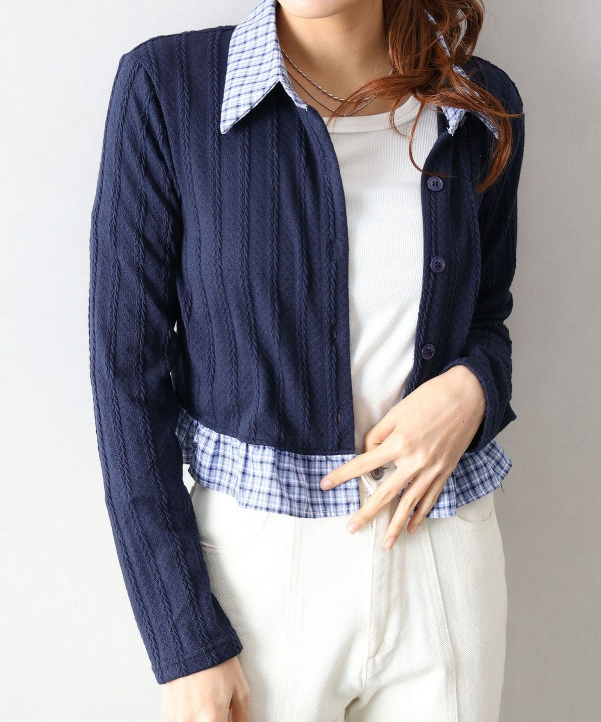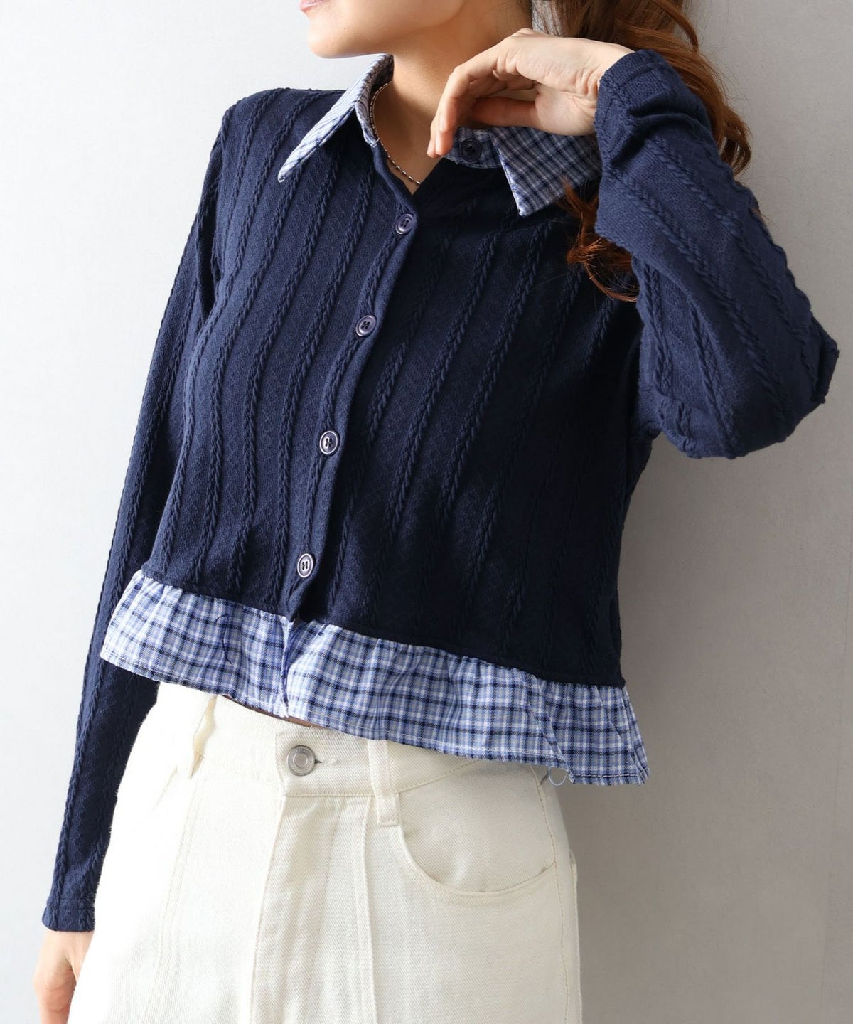 チェック切替フェイクレイヤードカーディガン