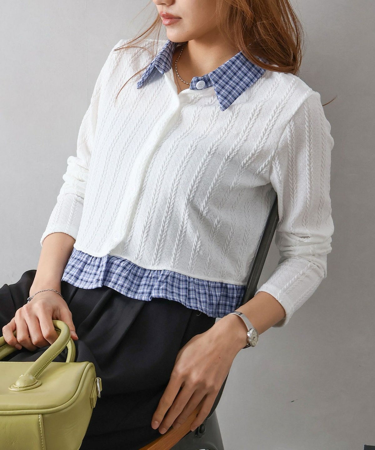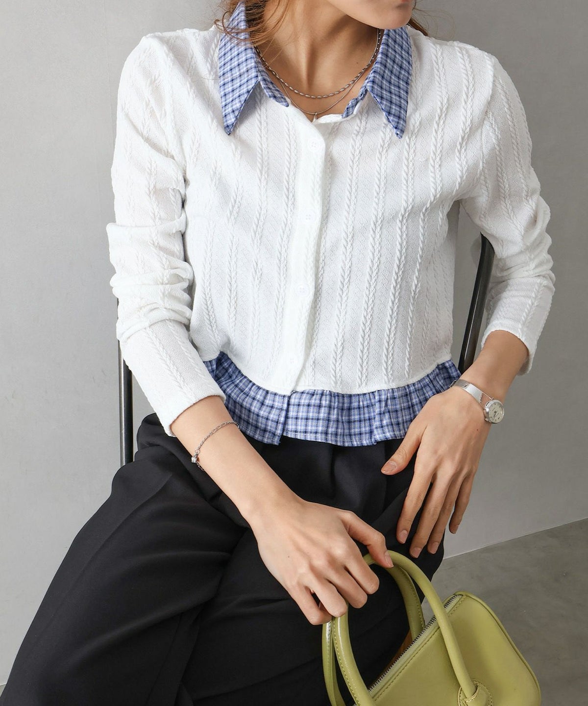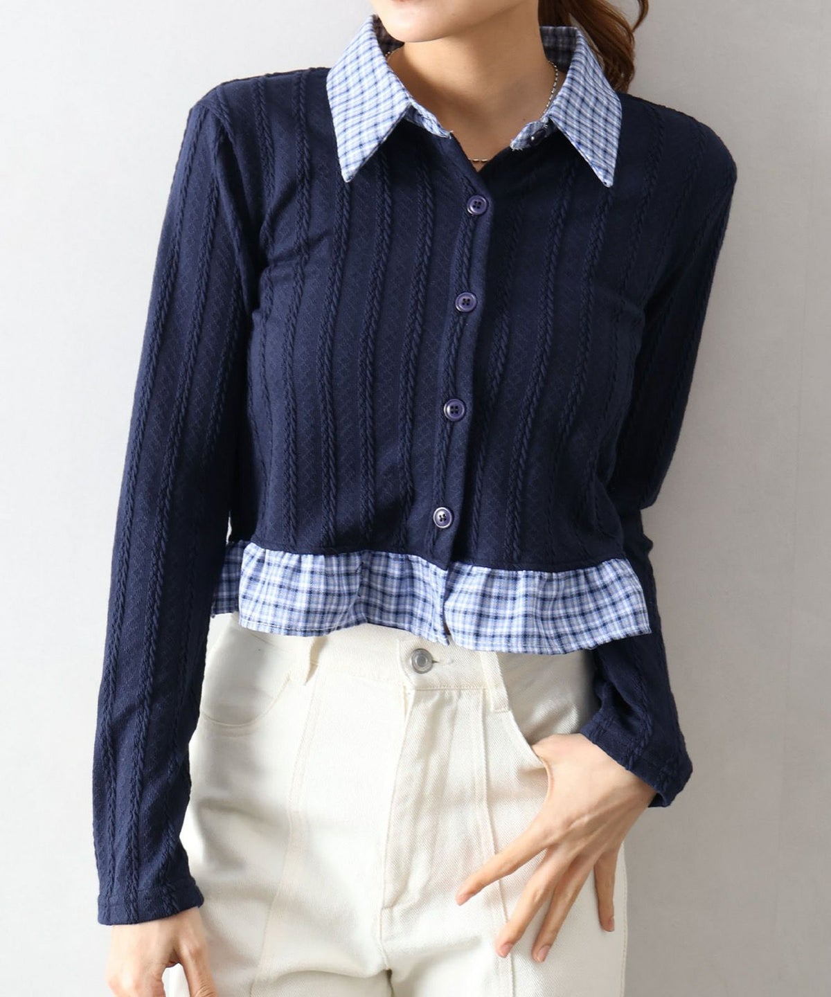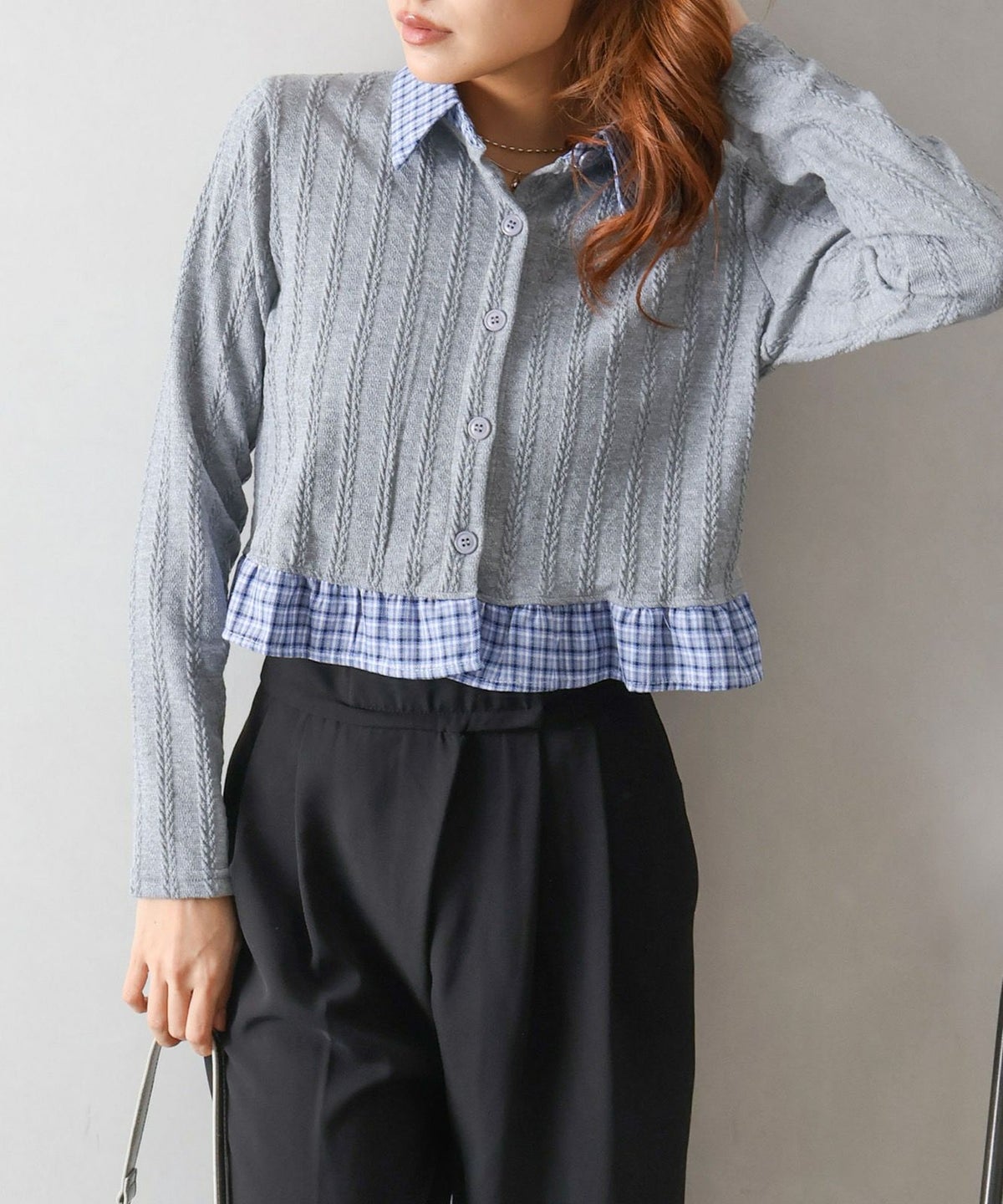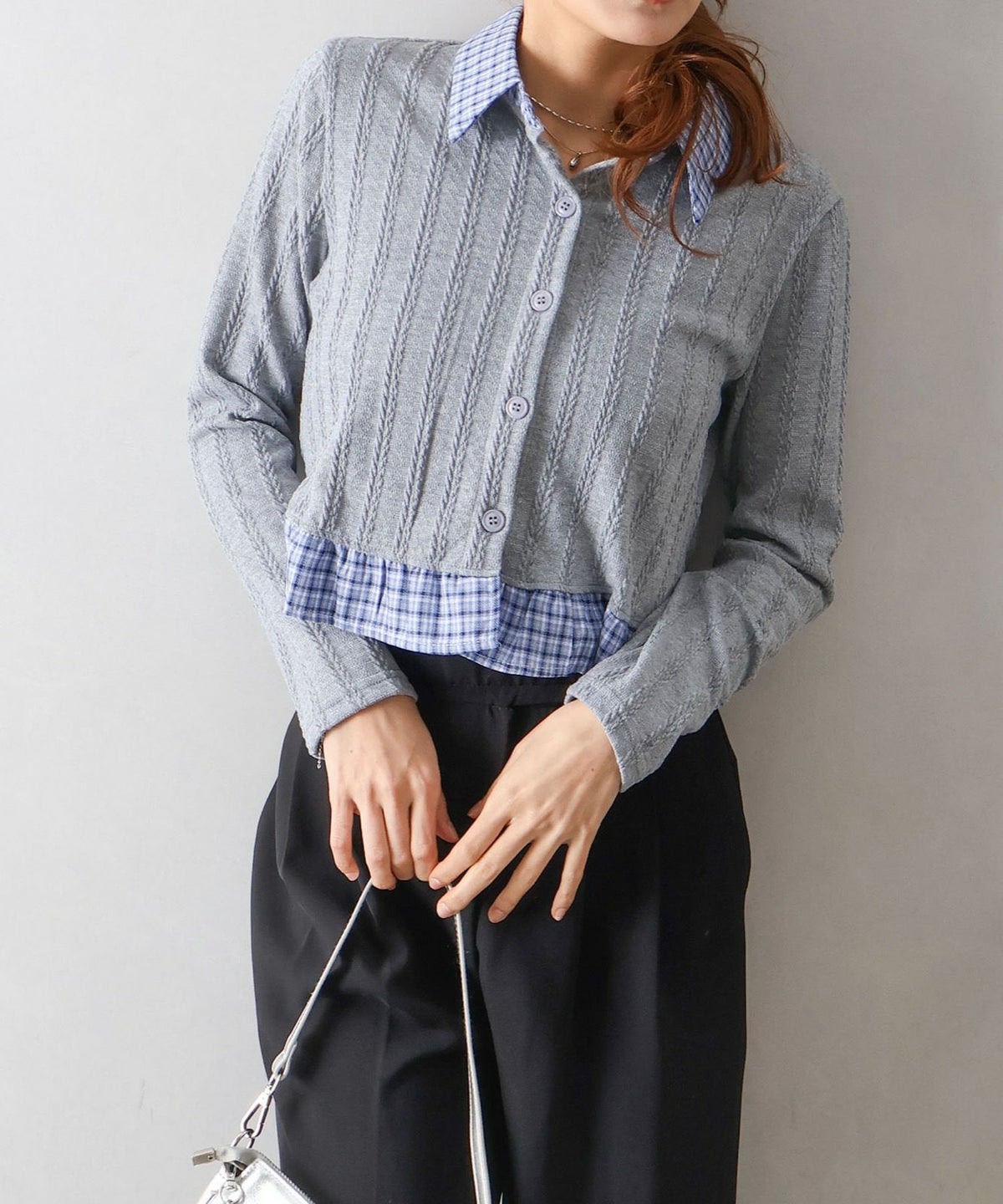 チェック切替フェイクレイヤードカーディガン