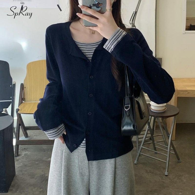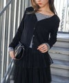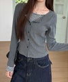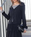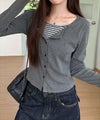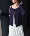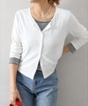 カーディガンにボーダートップスを重ね着したような、こなれ感たっぷりのレイヤードデザイン。