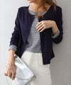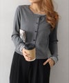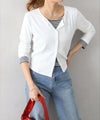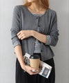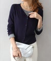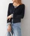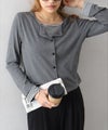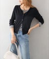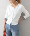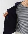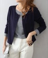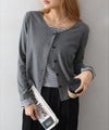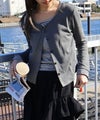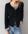 シンプルなクルーネックカーディガンをベースに、衿元と袖口から覗くボーダーがアクセントに。