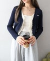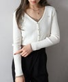 縦のラインを強調する細リブ素材とコンパクトなショート丈により、スタイルアップ効果が抜群の一枚。胸元のメタルプレートや上品なボタン使いがアクセントになり、シンプルながらも高級感のある印象に仕上がっています。