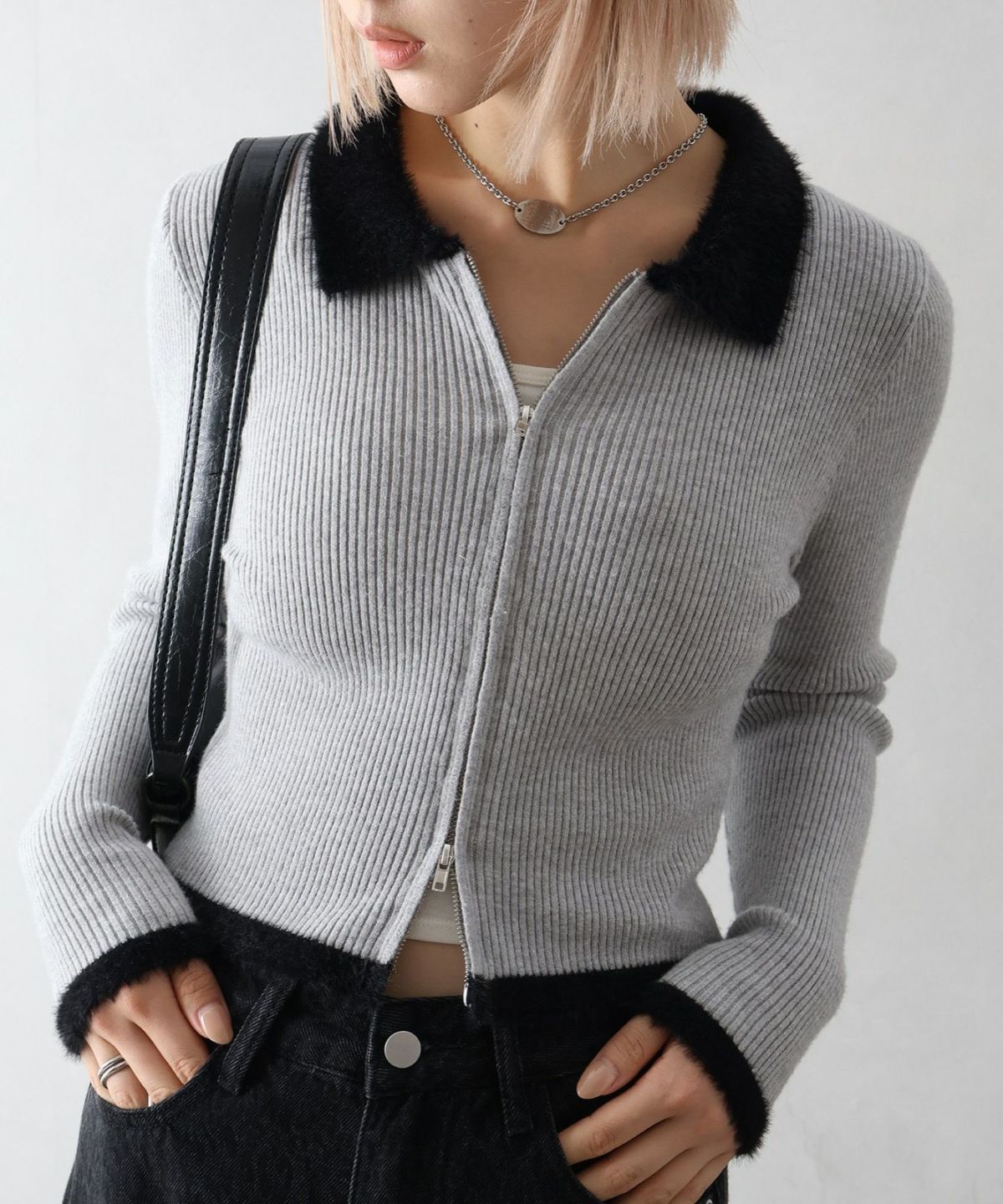 フェザー衿ジップカーディガン