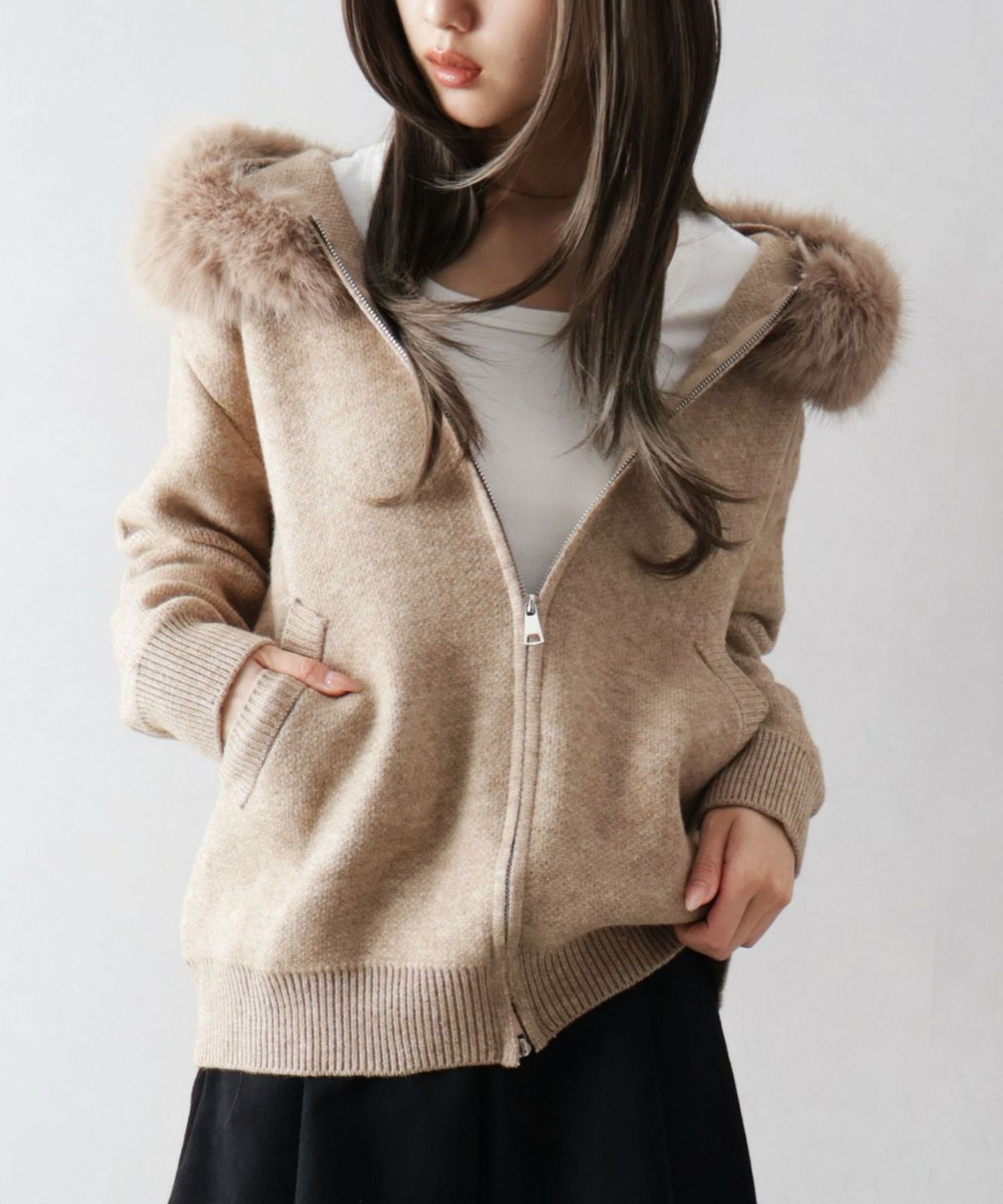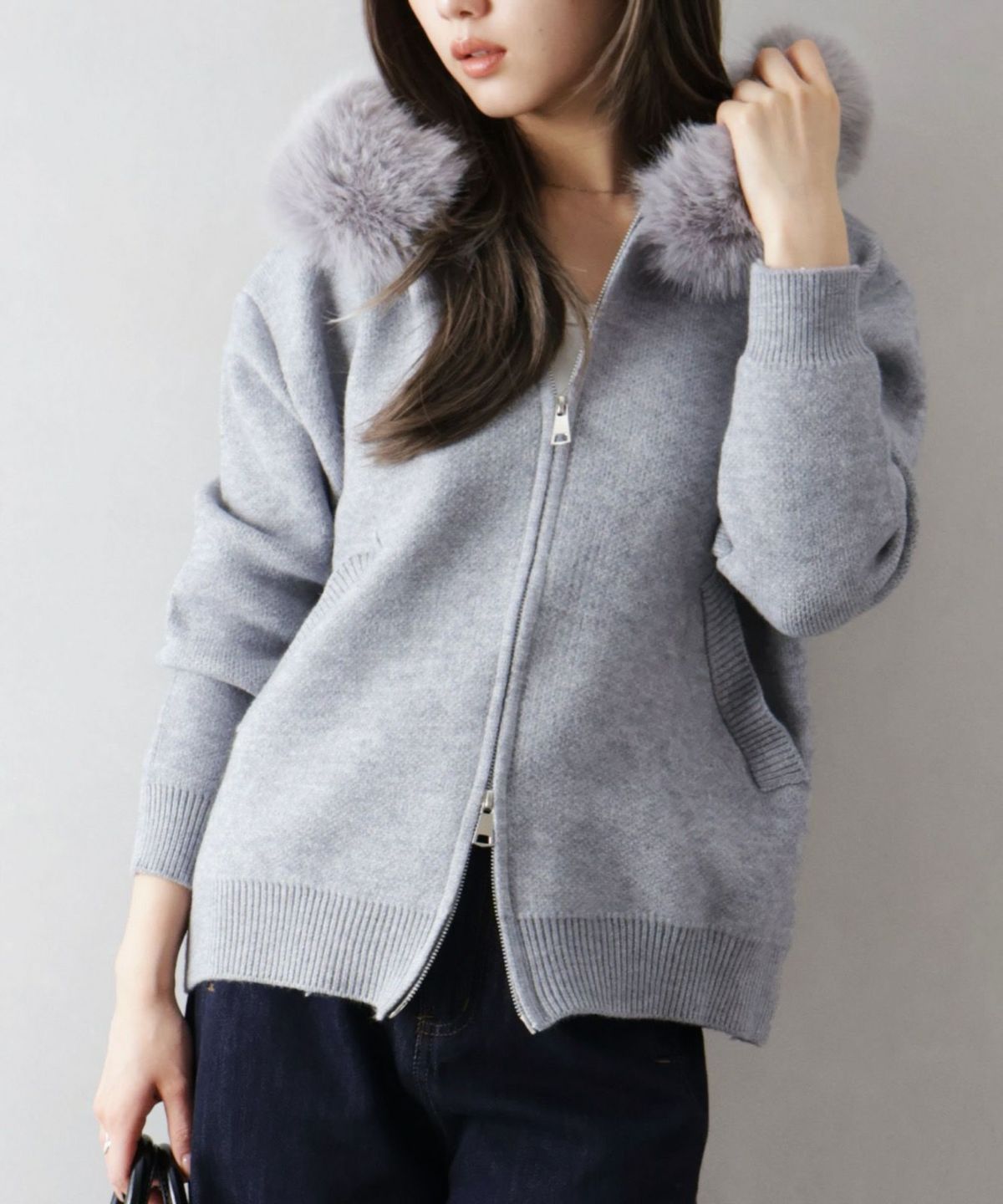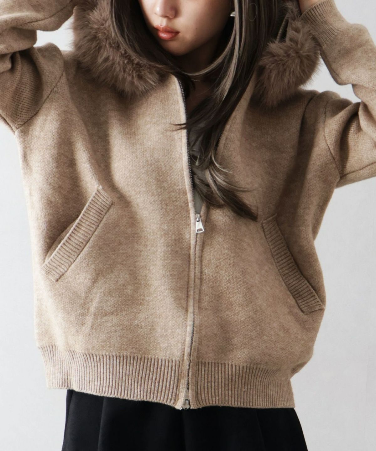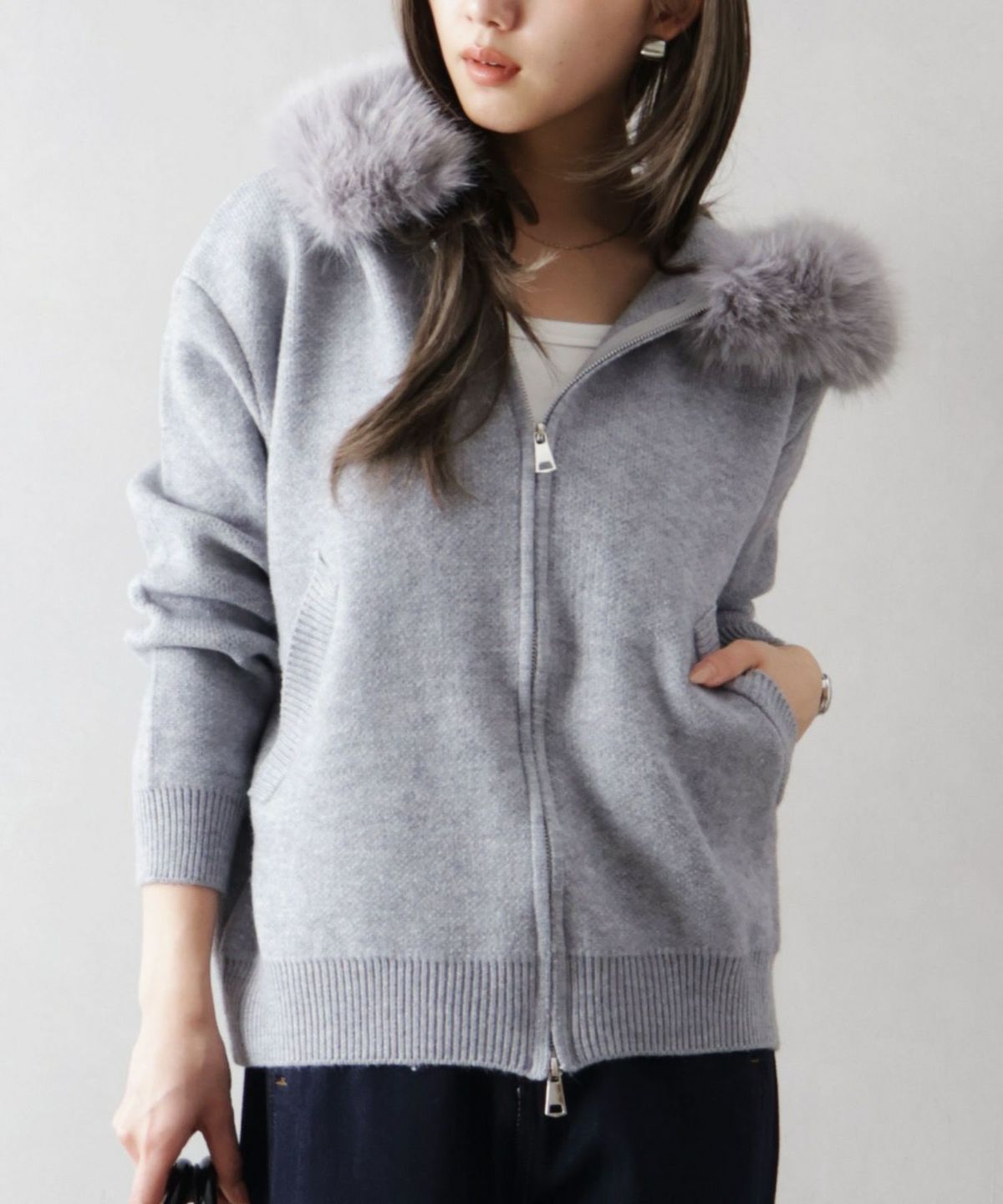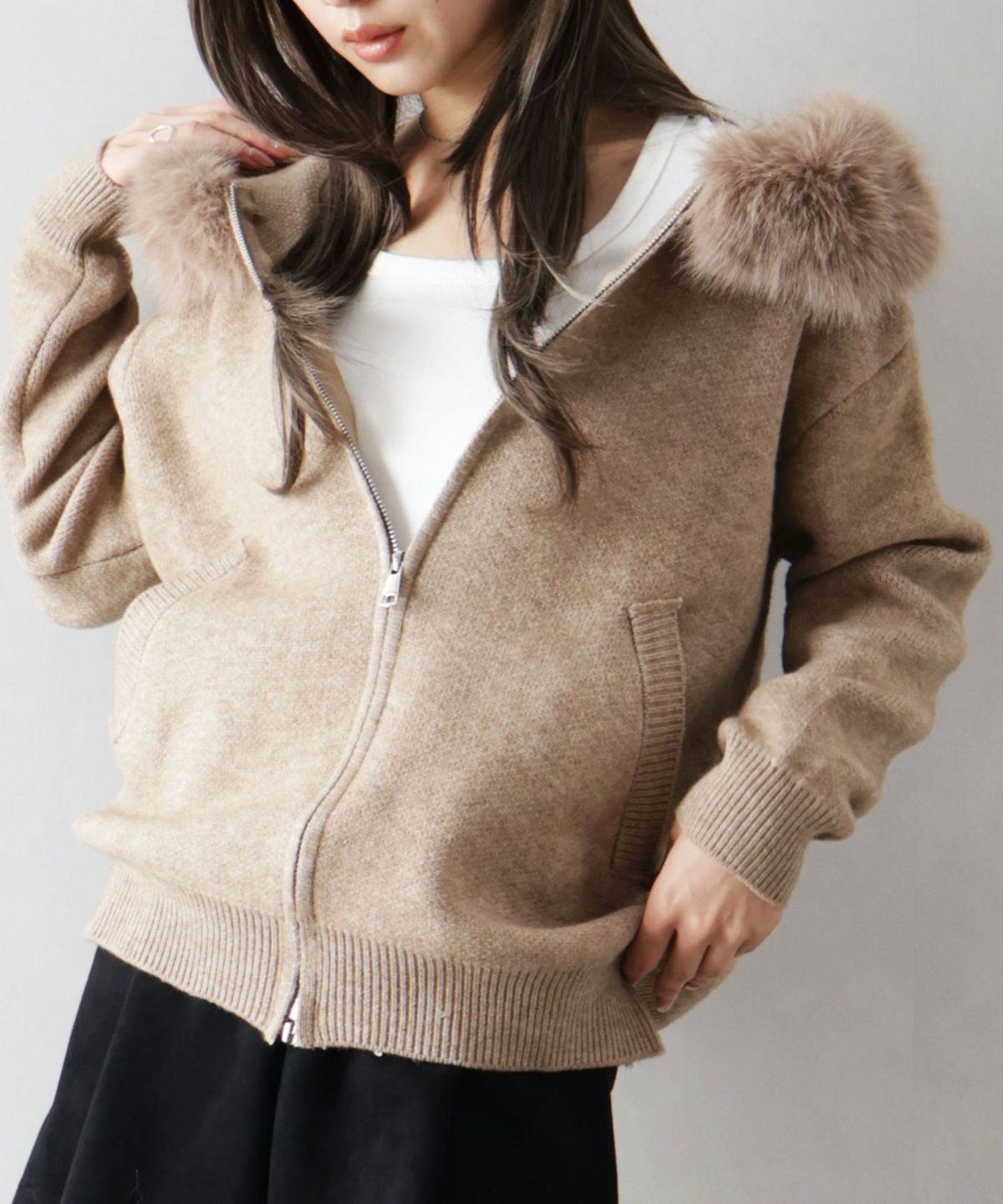 ファー付ニットロングジップパーカー