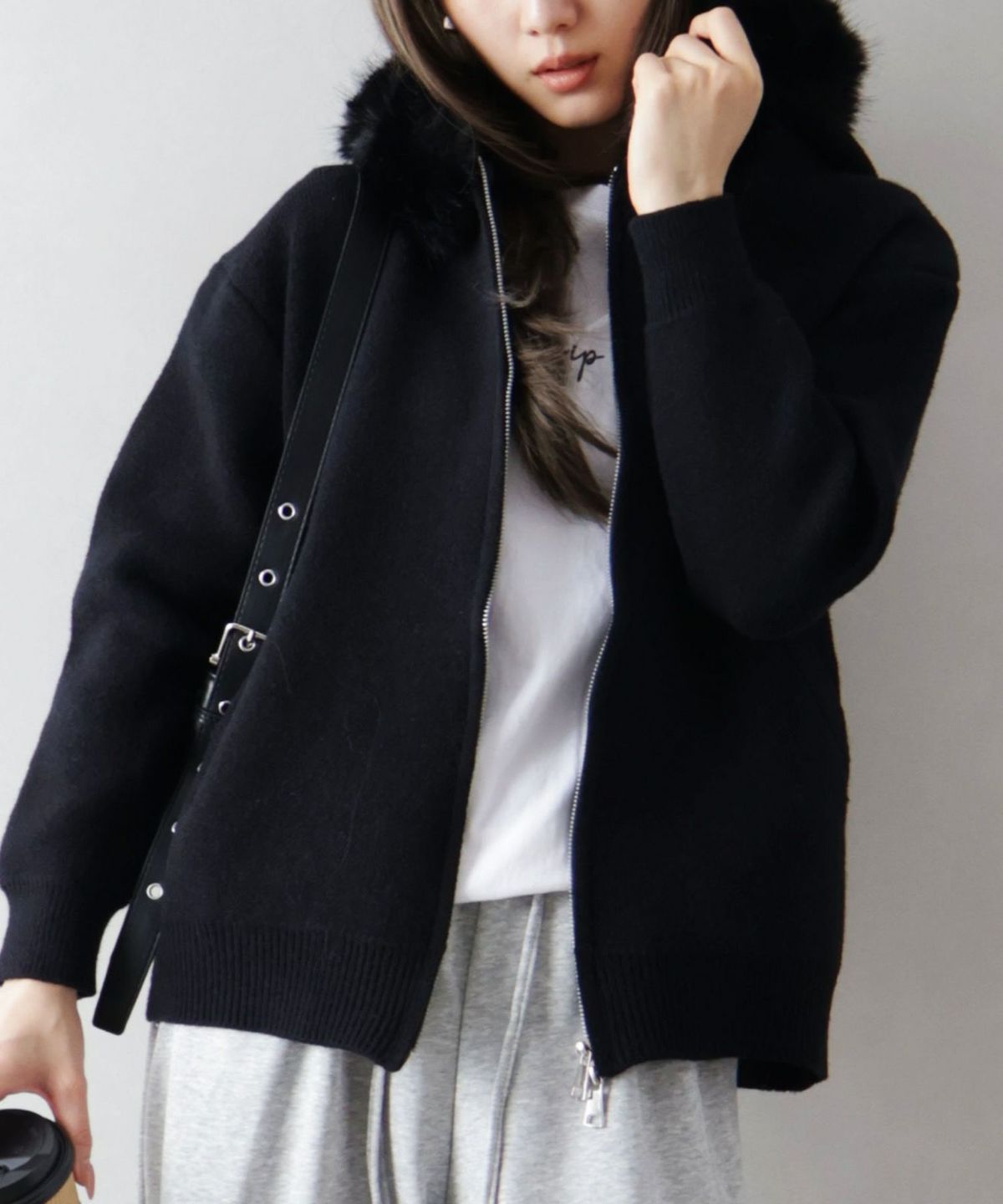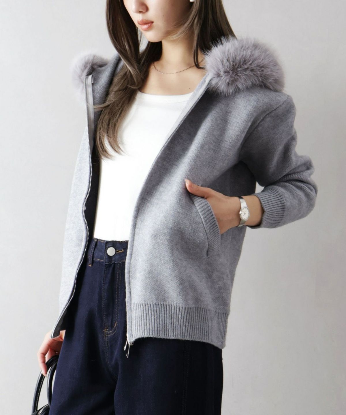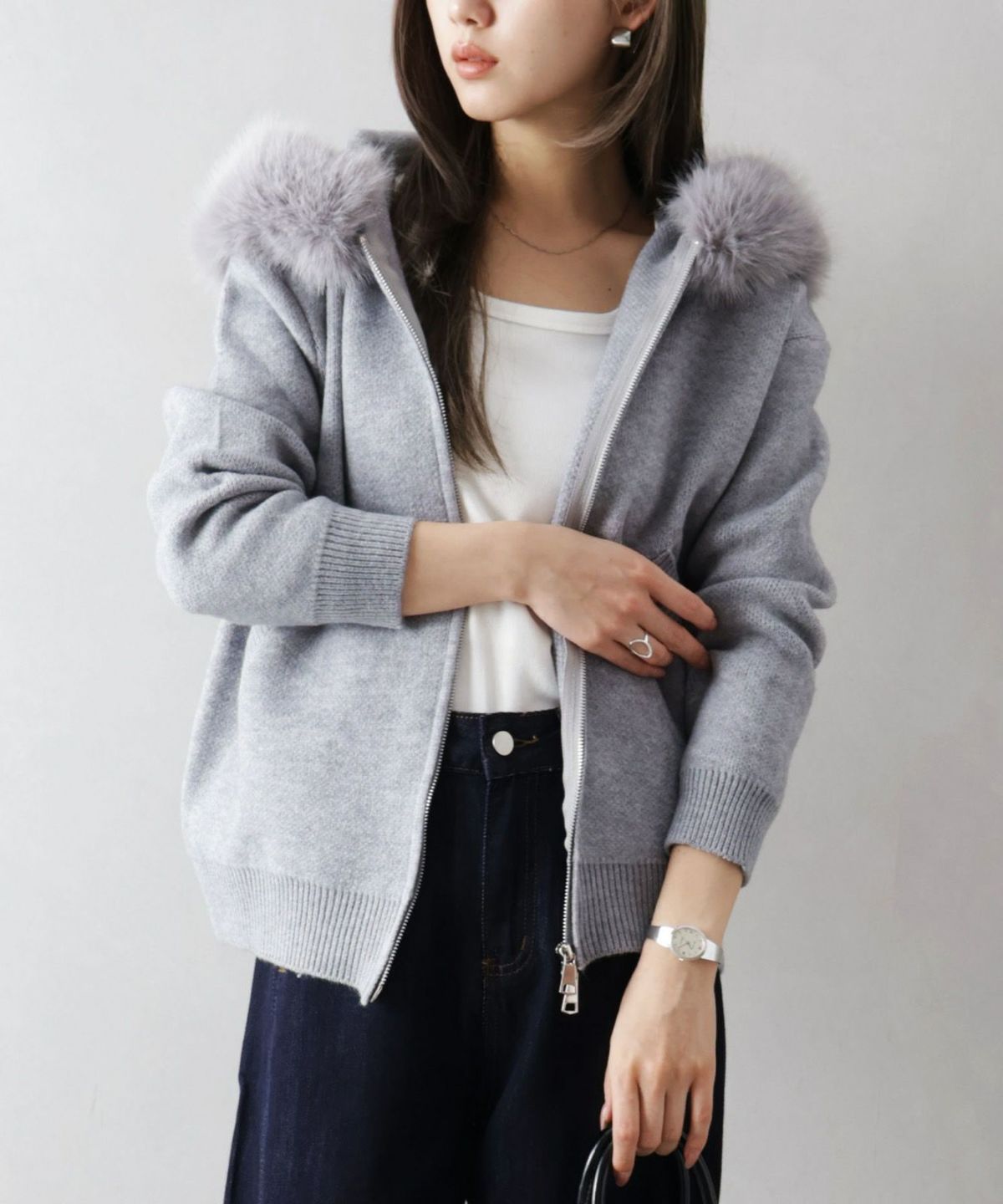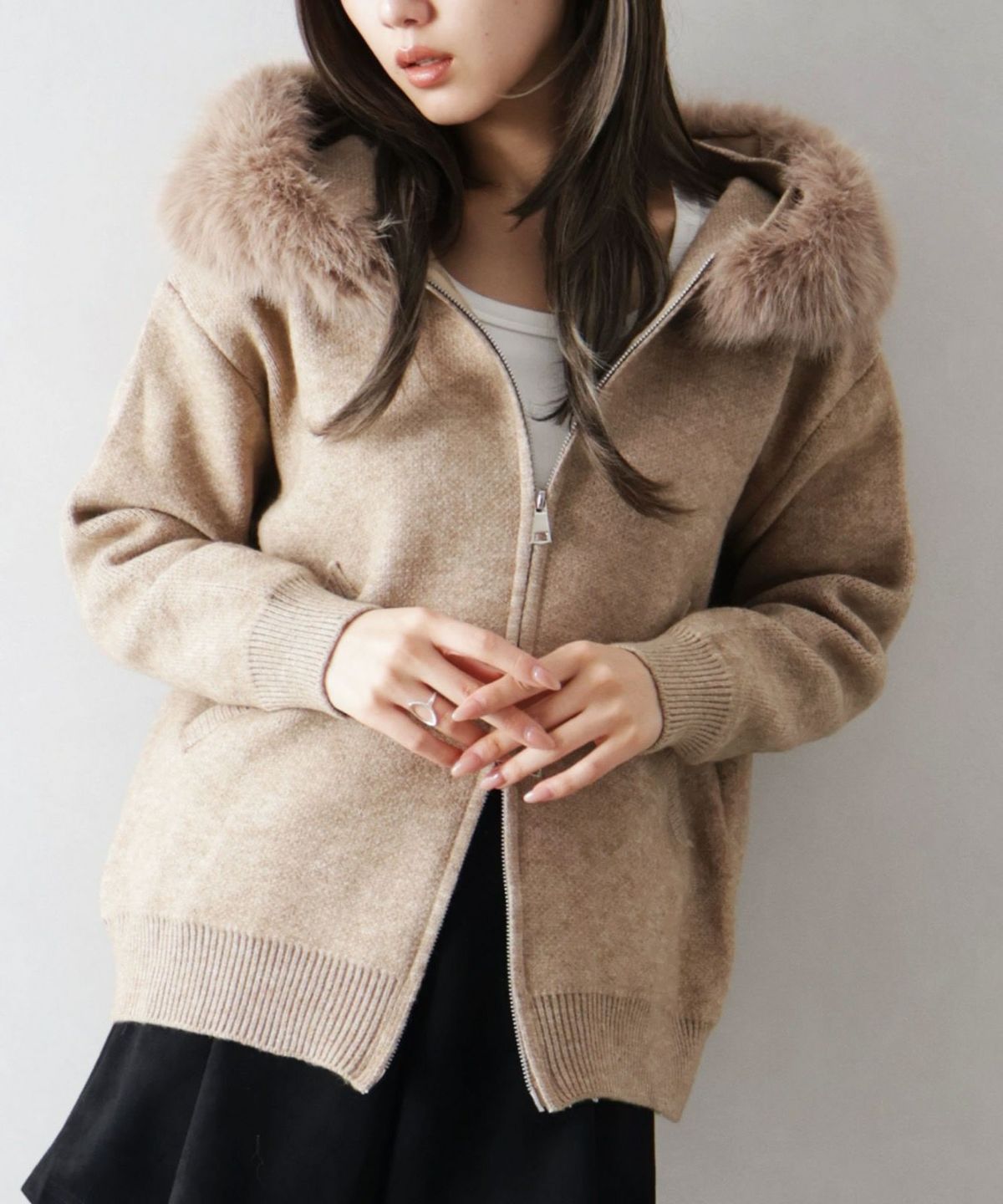 ファー付ニットロングジップパーカー