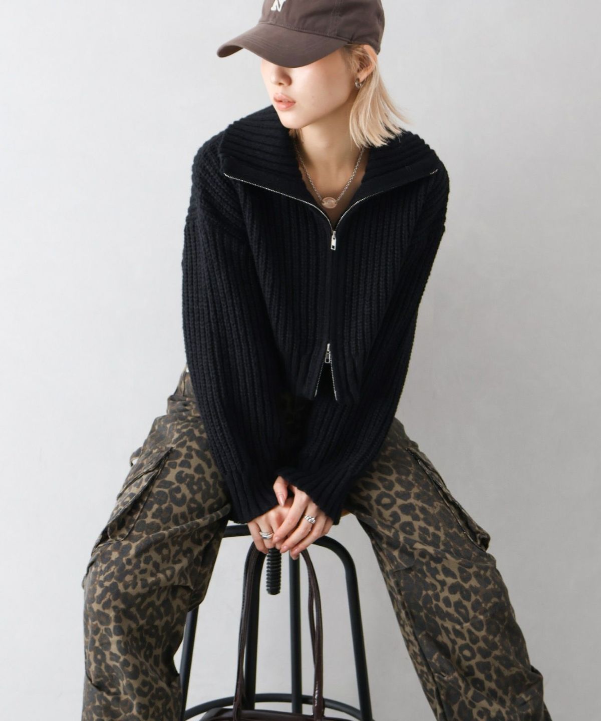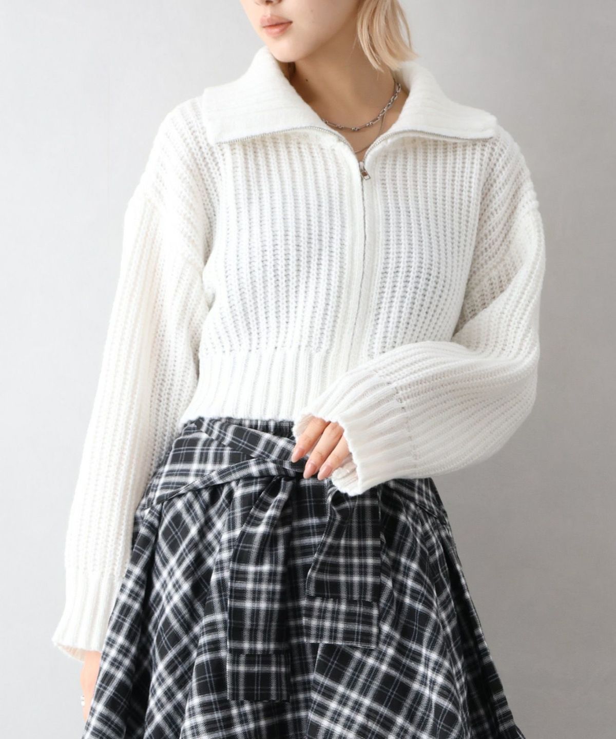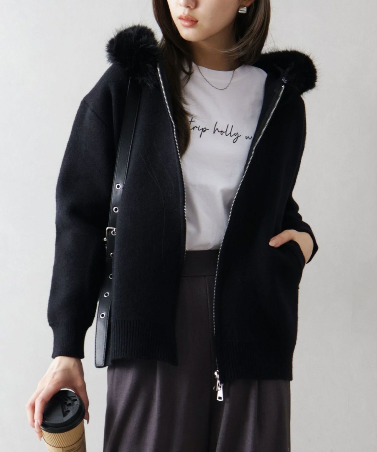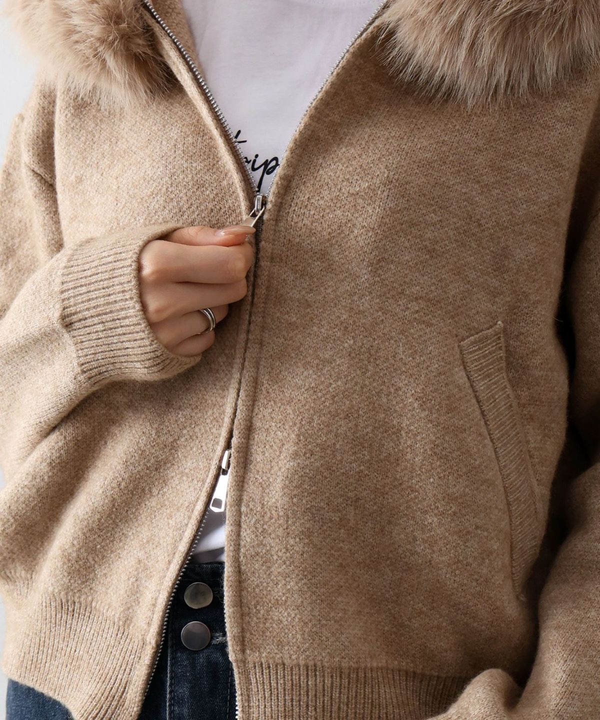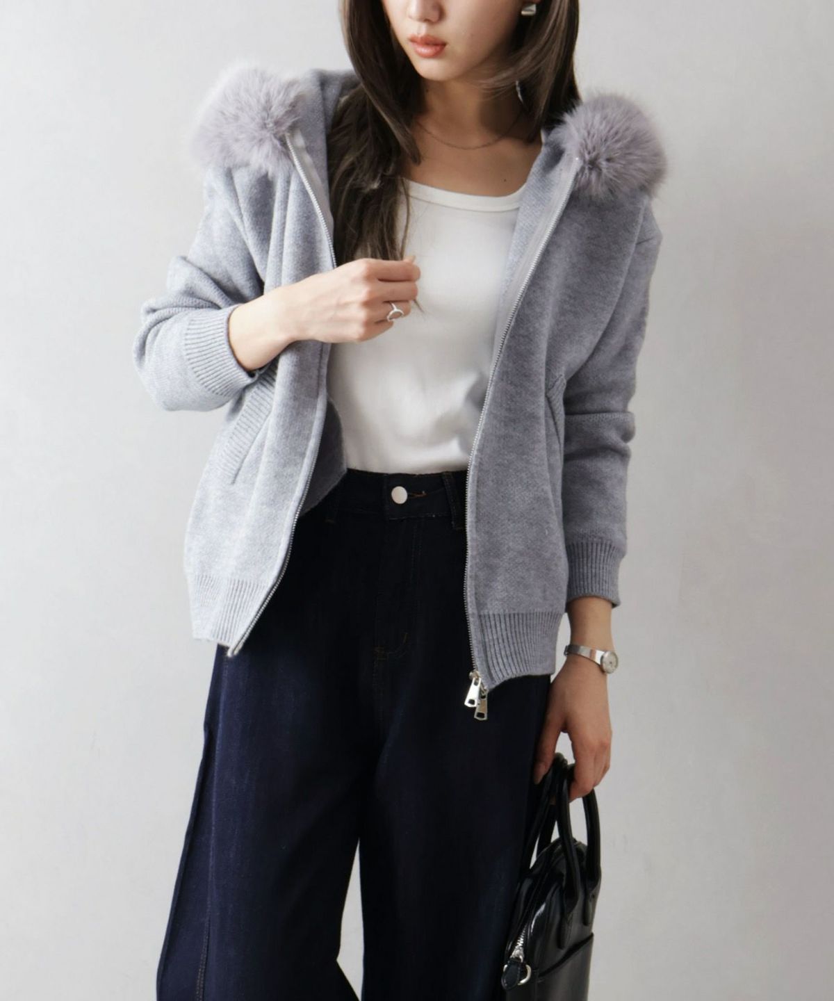 ファー付ニットロングジップパーカー