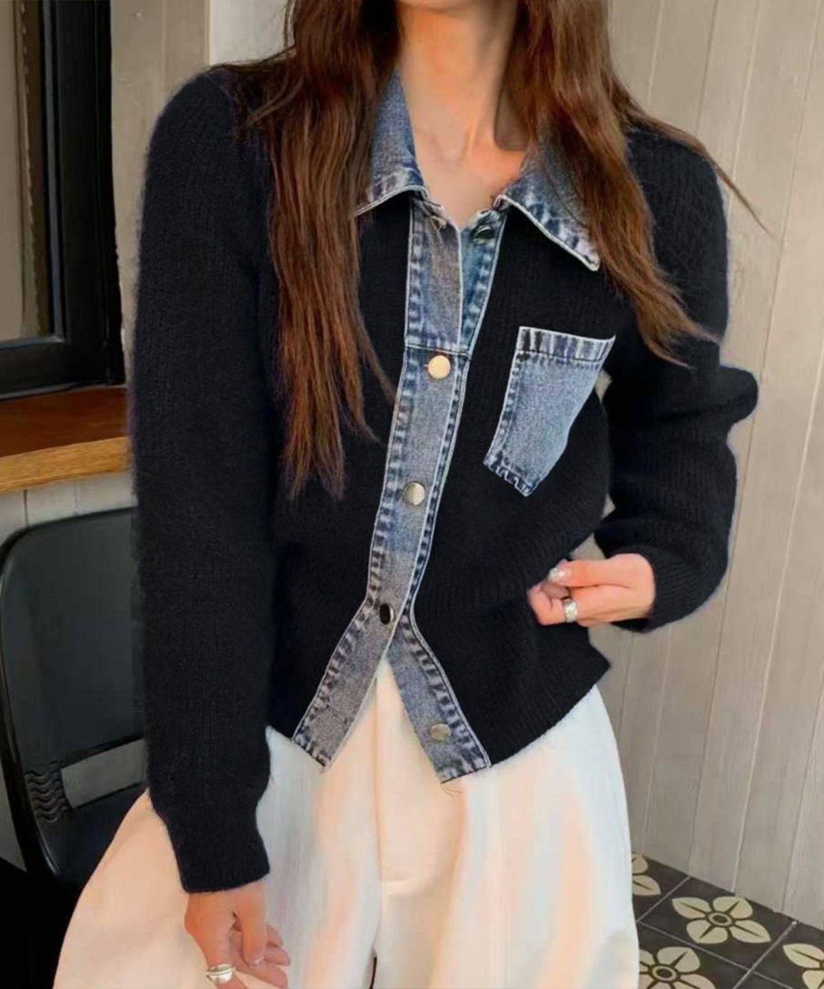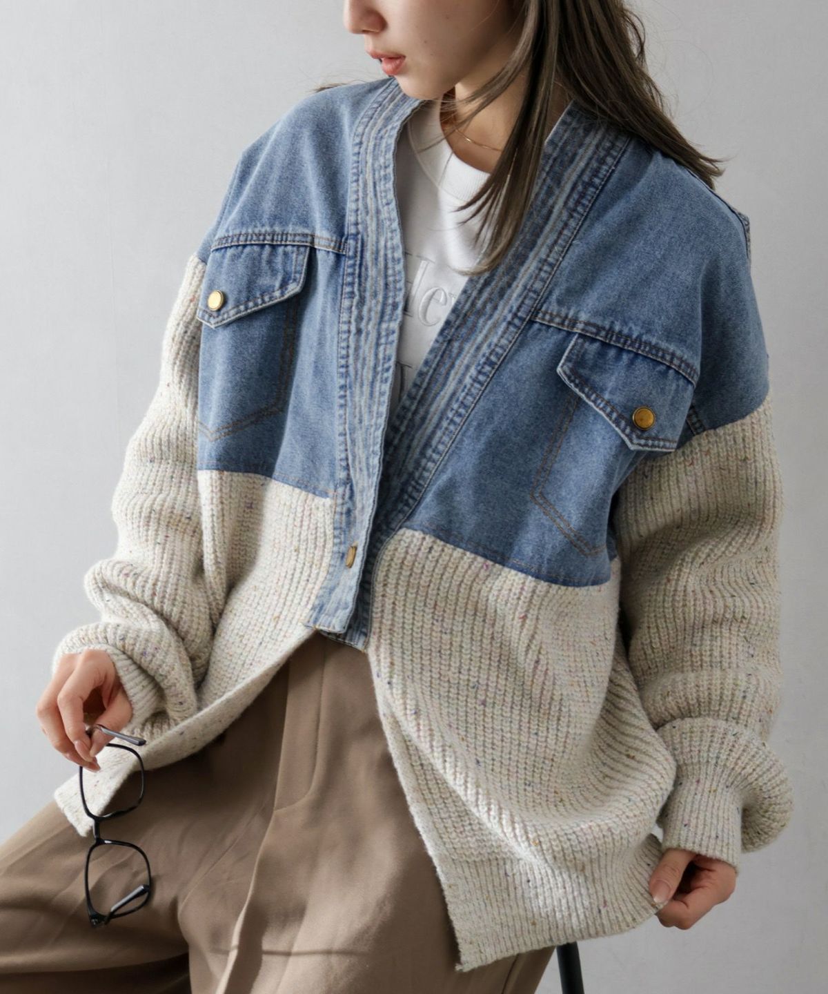 デニムポケット付き切替フェイクレイヤードカーディガン
