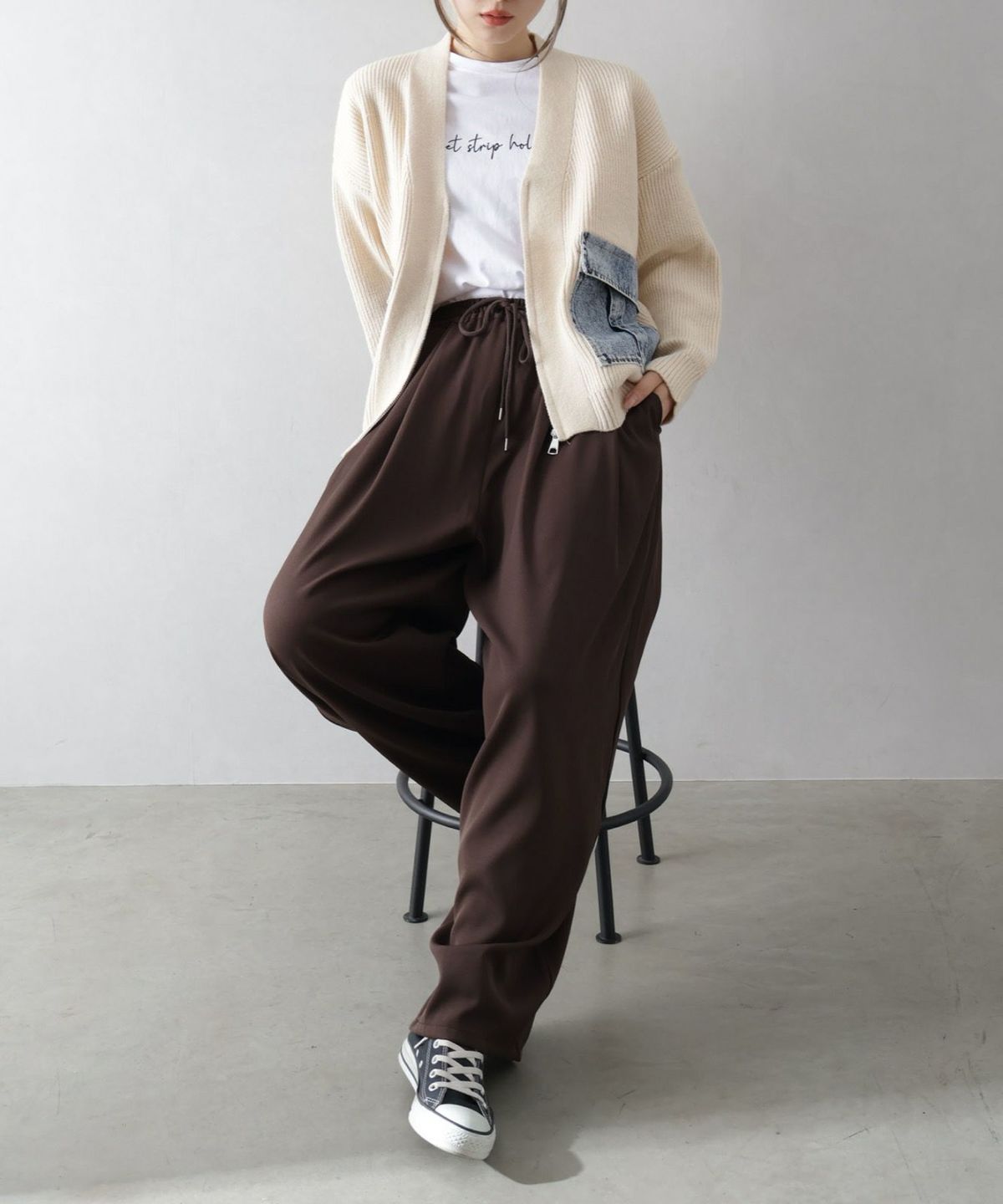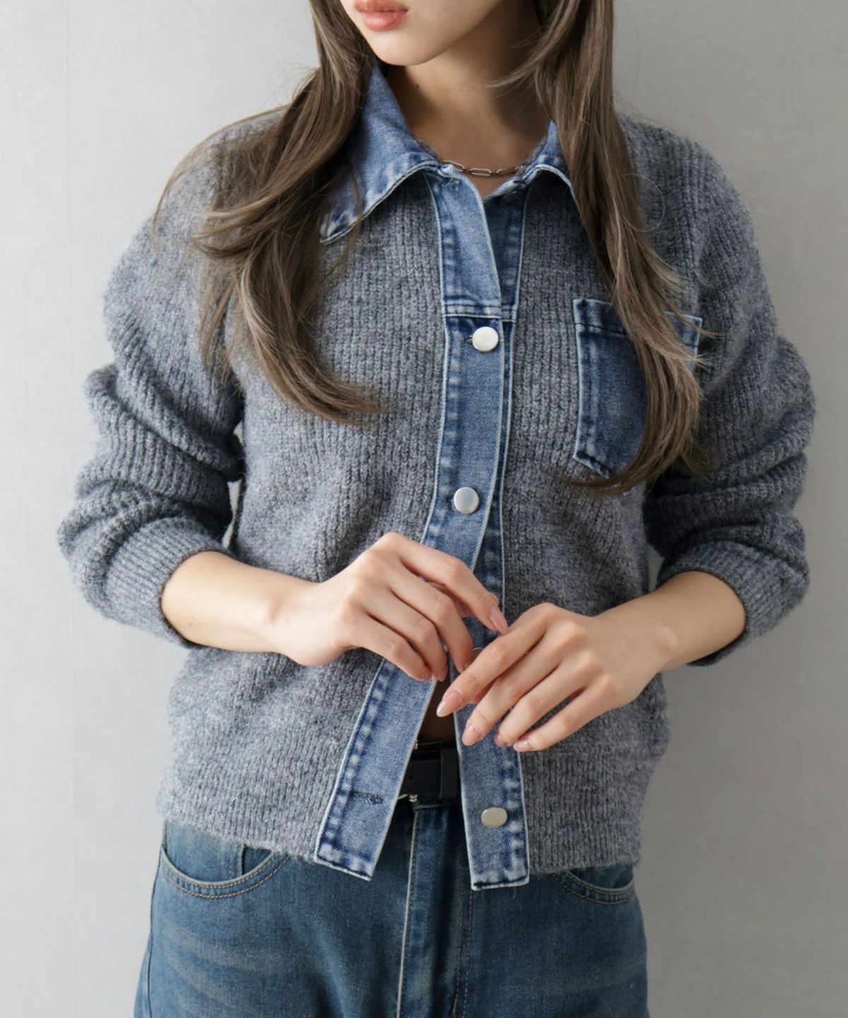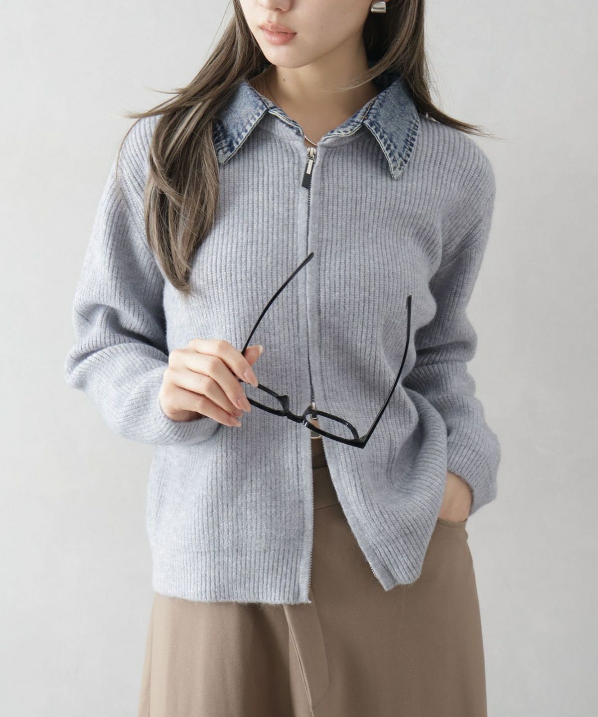 デニム衿ジップニットカーディガン